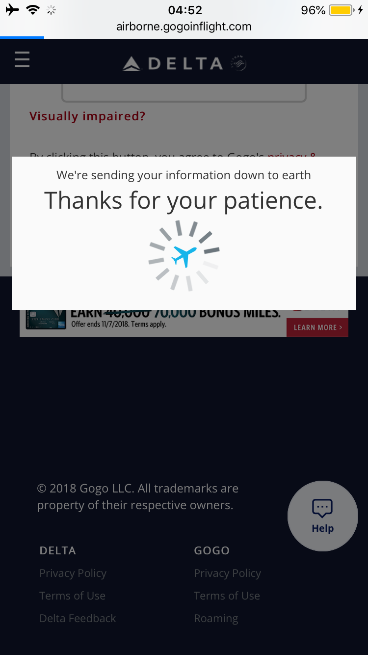 Тарифы бортового интернета Дельта и интересные сообщения, периодически появляющиеся при исчезновении соединения.