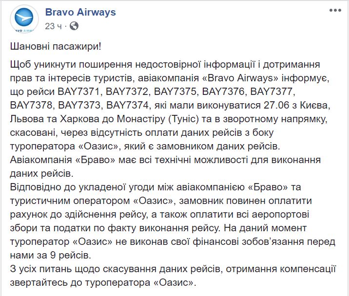 С июня 2018 года авиакомпанией «Bravo Airways» систематически нарушались условия договора по осуществлению чартерных рейсов в Тунис, задержки по вылетам составляли более 13 часов. Тем не менее, компания «OASIS Travel Ukraine», со своей стороны, продолжала и продолжает выполнять свои обязательства как перед авиакомпанией «Bravo Airways», так и перед туристами, которым за счет компании «OASIS Travel Ukraine» продлевалось проживание в отелях Туниса, предоставлялись скидки и бесплатные экскурсии.