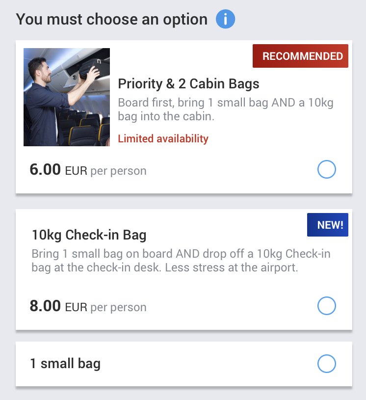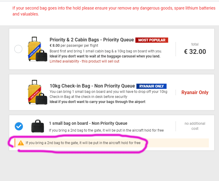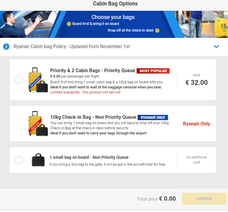 If you have not purchased Priority & 2 Cabin Bags, you are only permitted to bring 1 small personal bag on board (max 35cm x 20cm x 20cm) that must fit under the seat in front of you. Your second bigger 10kg cabin bag (max 55cm x 40cm x 20cm) will be tagged at the boarding gate and put into the hold free of charge and can be collected at the baggage carousel on arrival.