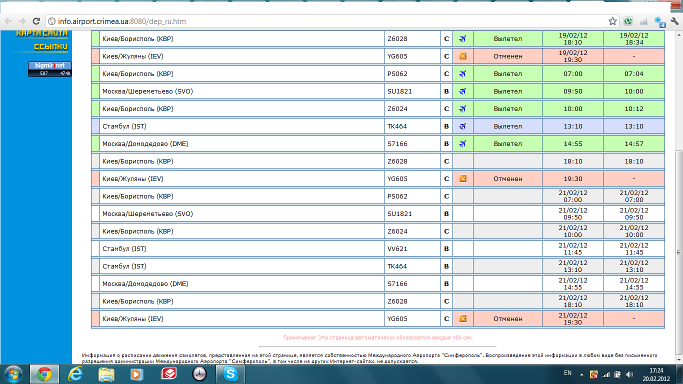 Система бронирования Амадеус (без посредников) выдает стоимость прямого перелета на Крымских Зорях по маршруту Симферополь (аннексирован Россией)-Харьков- Симферополь (аннексирован Россией) 4107 гривен ( при цене 2703 грн. при полете Днеправиа через Киев), Симферополь (аннексирован Россией)-Донецк-Симферополь (аннексирован Россией) 3067 гривен ( при цене 2629 грн при полете МАУ через Киев). При таких ценах, да еще и при таких самолетах, только самоубийцы полетят с КЗ. Кстати, Амадеус и понятия не имеет о Крымских Зорях, все рейсы обозначает как выполняемые Южными Авиалиниями. Что сказать - очередной раз отмыли бабло под вывеской благ для народа!!! Украина, одним словом!!!