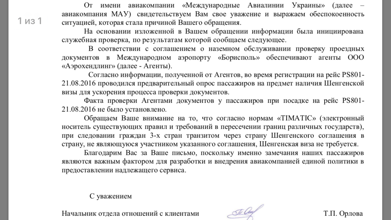 Спустя почти 4 месяца получил ответ от МАУ на свое обращение по обозначенному выше поводу. Они уверяют, что отправляли ответ еще 16 сентября, однако, я ничего на почту не получал. Ответ, на мой взгляд, похож на отписку.XII писав:Вчера летел из Киева в Москву с пересадкой в Варшаве (МАУ+LOT). Был очень удивлен проверкой на гейте наличия шенгенской визы. Она у меня, к счастью, была, но проверявшая документы девушка сказала, что отказала бы в посадке на рейс, если бы ее не было, даже несмотря на то, что видела второй посадочный на рейс до Москвы. Впервые сталкиваюсь с таким требованием.