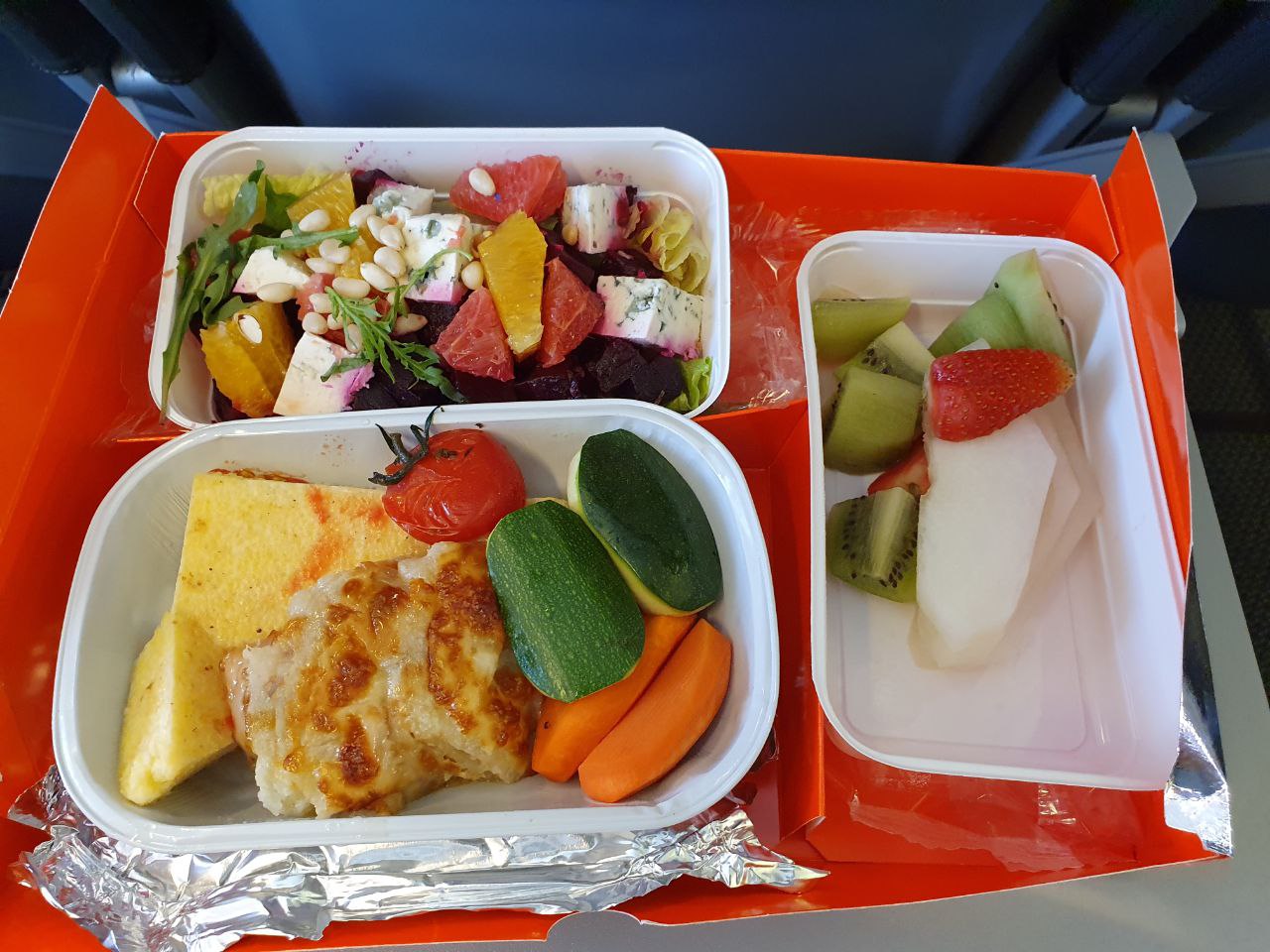 По вкусу - отлично, все вкусно, свежее, объем приличный. Из неудобств - буряк в салате пускает много сока, и его нужно есть супер аккуратно, чтобы этот сок не разбрызгать на все вокруг. Что в условиях тесного салона Скайапа тяжело.