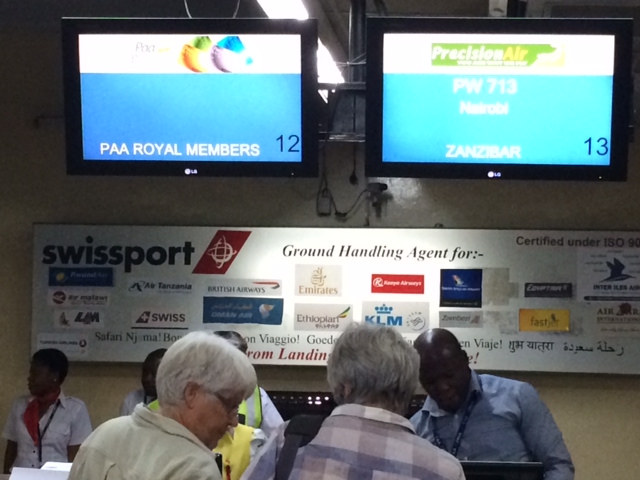 Зона вылета Международного аэропорта Дар-Эс-Салама производит не самое приятное впечатление: хаос, грязь, отсутствие точной информации. На входе в здание проходит контроль безопасности, все вещи просвечиваются, прямо как в Москве. Дальше пассажиры оказываются в маленьком неуютном и плохо освещенном зале регистрации. Судя по табло, регистрация на наш рейс должна была проходить на 16 стойке, на самом же деле надпись Занзибар и номер нашего рейса светились над 13-ой, а регистрация вообще по факту проходила на 12-ой.