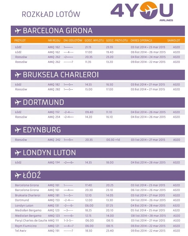 Щоб відсвяткувати нові оголошені маршрути, 4 You Airlines розпродує 7000 квитків для мандрівників в усіх напрямках за ціною PLN 47 (в одну сторону, в тому числі платежі та збори). Квитки будуть доступні у продажу з 1 серпня 2014 на www.4YOUAIRLINES.com