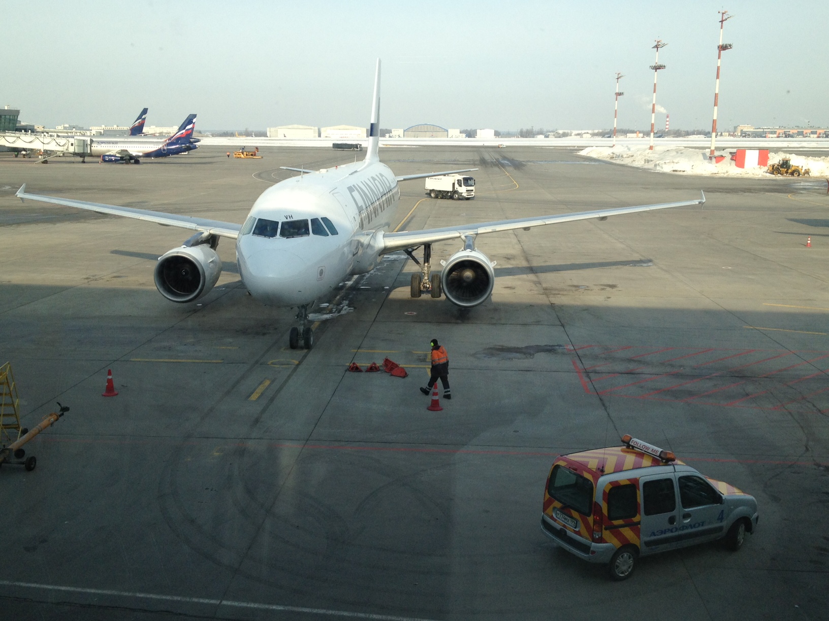У меня был аэрофлотовский билет, поэтому зачекинится на рейс онлайн не удалось. Я специально приехал в Шереметьево пораньше, чтобы зарегистрироваться на место в начале салона, так как в Ваантее у меня была негарантированная двухчасовая стыковка, в которую предстояло вместить еще и встречу с одним человеком в аэропорту. Расчет оказался верным-я получил место 8А. Борт был заполнен процентов на 70, почти все места В и Е пустовали. Перед началом полета капитан вышел на связь, поприветствовал пассажиров, сообщил погоду в Хельсинки и время в пути - 1 час 30 минут.