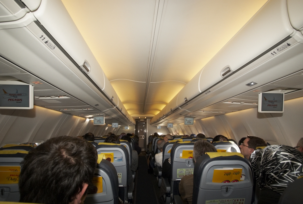 Одного года от роду борт Boeing 737-800 c регистрацией TC-AAT сверкал своей новизной и идеальной чистотой. Внутри он , кроме пегасусовских салфеток на подголовниках кресел,ничем не отличался от хорошо знакомых мне аналогичных боротов Air Berlin в максимальной компоновке на 189 пакасов. Мониторы inflight-entertainment показали известную инструкцию о безопасности в исполнеии детей сотрудников пегасуса, а затем весь полет реклама чередовалась с информацией о полете.