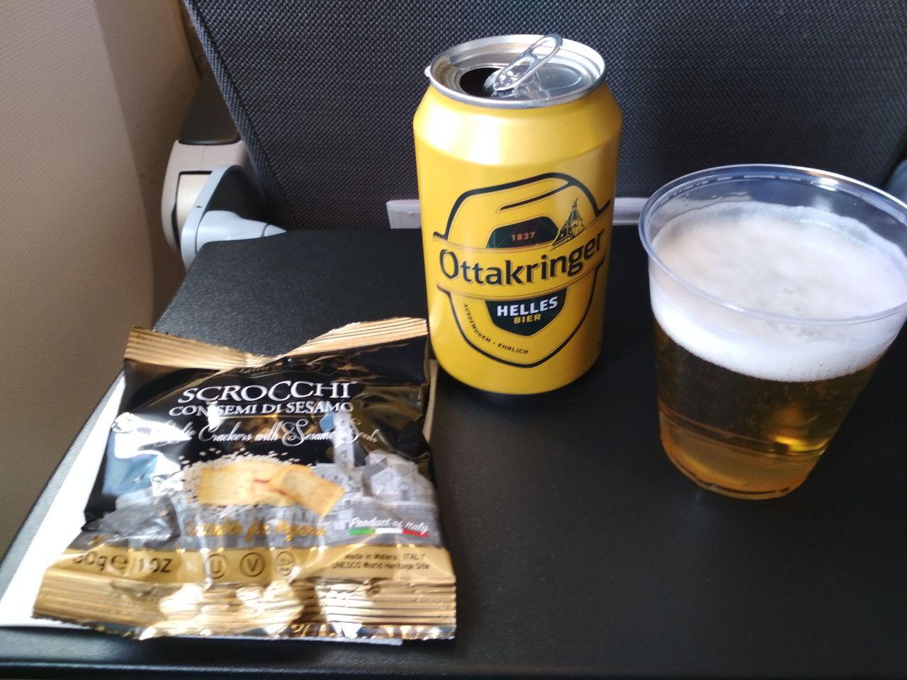 Туди був бутерброд з чорного хліба з яєчно-сирною намазкою і зеленою цибулькою. Смачно, але не завадило б додати туди ще шматочок шинки. З напоїв були кава, чай, соки-води. Хоча, коли я потім ішов в туалет, то бачив групу іспаномовної молоді, яка сьорбала пиво Хайнікен з характерних маленьких баночок, також у возику було вино в пляшечках.