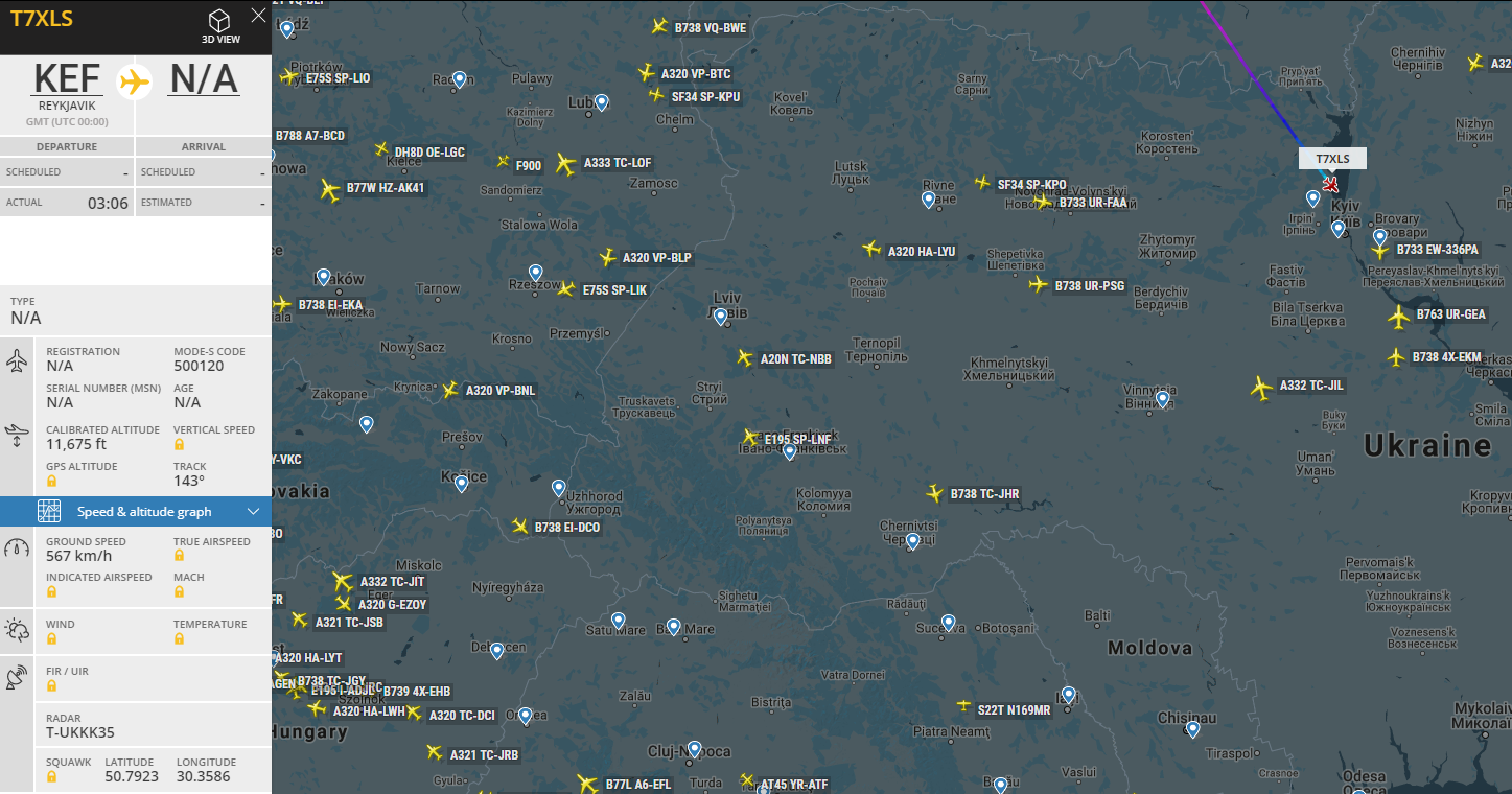 Майже всю дорогу летів на 43 тисячах - швидше всього якийсь private jet. Ну і сів в Жулянах, що підтверджує. Можливо хтось летів з Америки з дозаправкою в Рек'явіку.