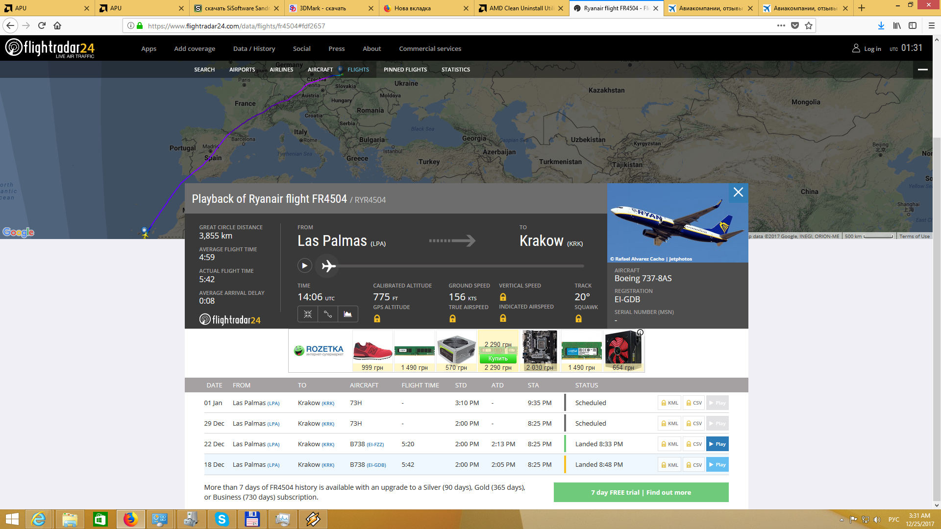 Летел 18 декабря рейсом FR4504 из Лас-Пальмас до Кракова и заметил в ФР24 интересный момент: по факту борт был EI-FZZ, а система отобразила, что якобы рейс выполнялся бортом EI-GDB.