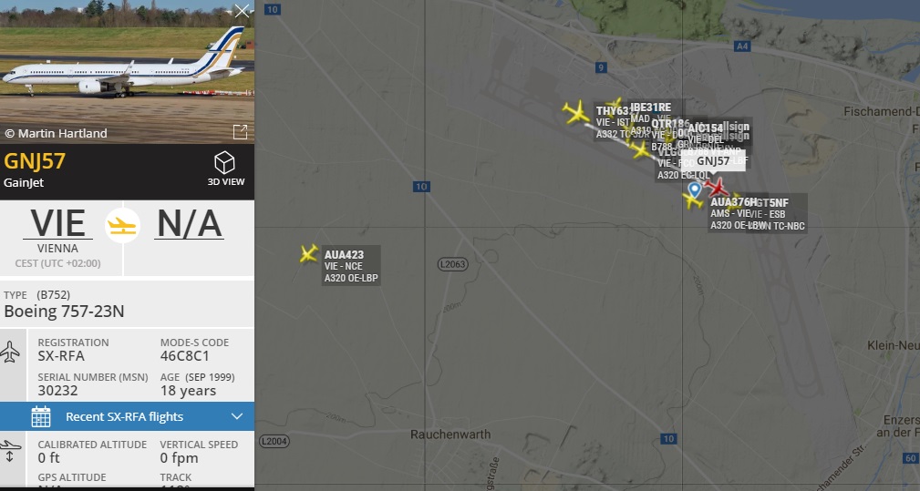 Бразильцы только что вылетели из Вены (товарищеский матч против Австрии) в Сочи. Используют B757 SX-RFA GainJet - бизнес класс. На нем прилетели в Вену.