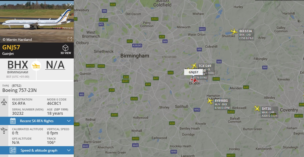 Англия перед вылетом в Петербург. В757 SX-RFA от GainJet полностью бизнес класс. Данное вс перевзло сборную Бразилию на чм 2018.