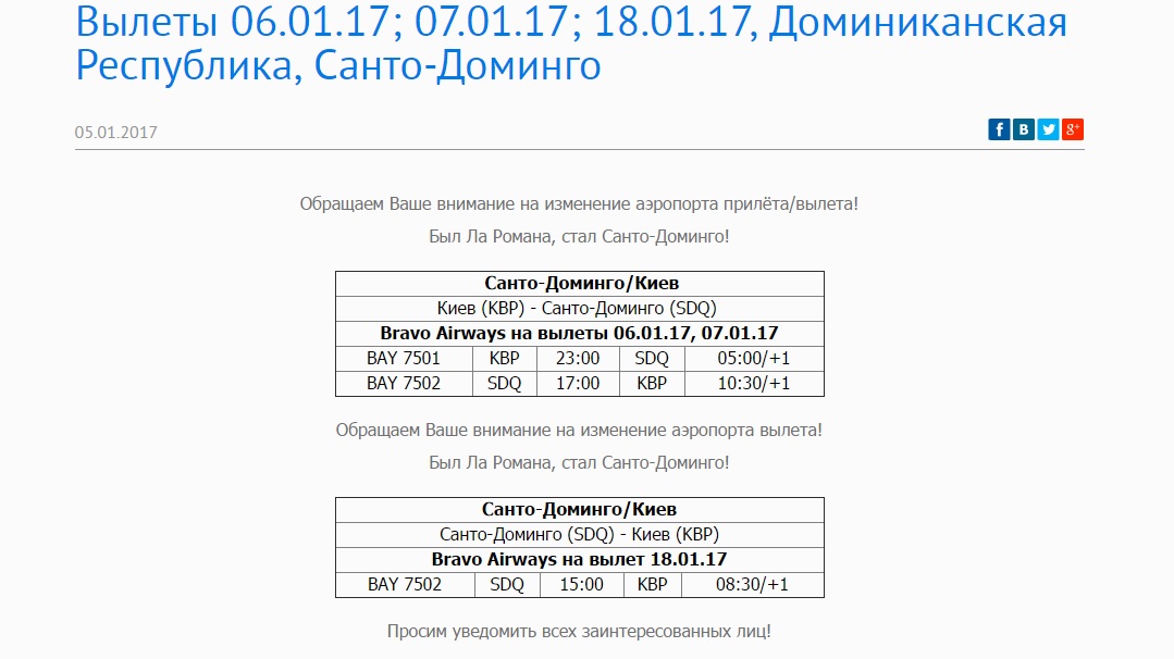 Чартерный рейс на Доминикану перенесён почти на двое суток 29.12.16
