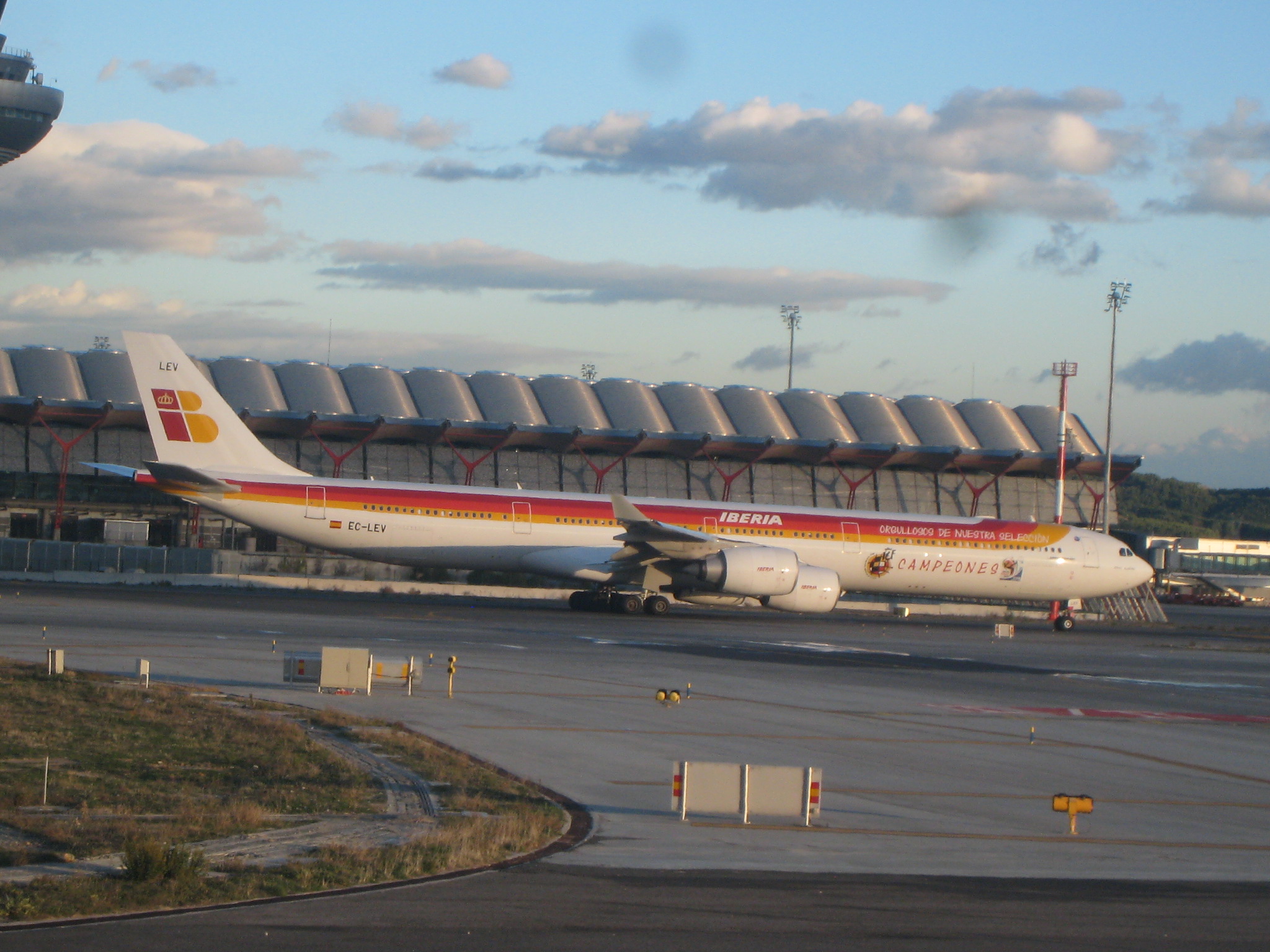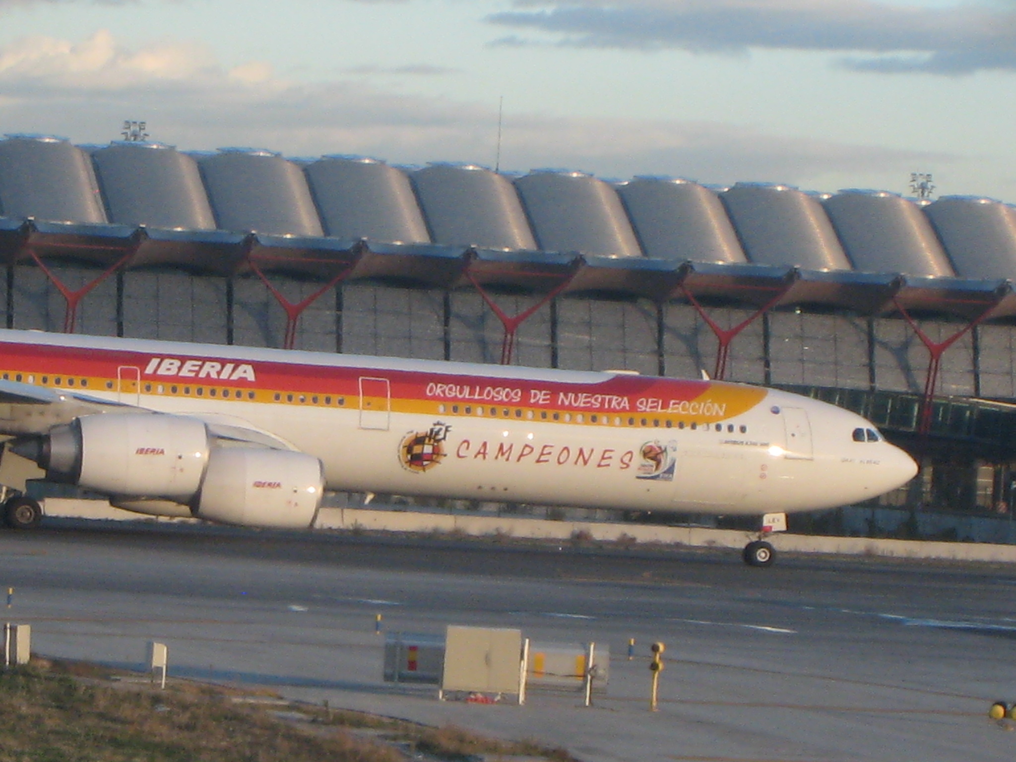 Фото жахливої якості, кращі викладу потім на свій Флікр. А в Мадриді був літак з написом "Горді за нашу збірну. Чемпіони" - я так розумію це саме той який збірну Іспанії віз з Мундіалю.