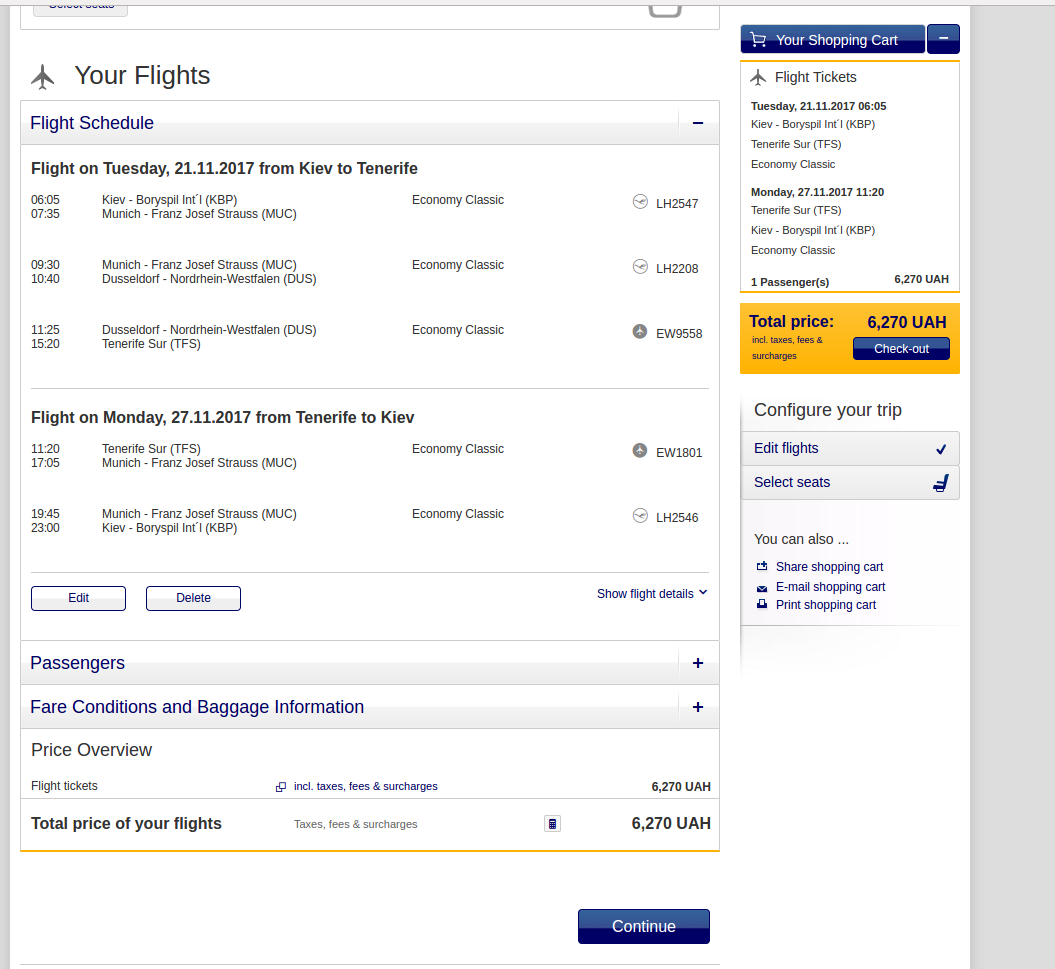Не могу найти, сделай плиз скринmakor писав:21-27 ноября Киев-Тенерифе на сайте Люфтганзы Киев-Тенерифе 6270 грн с багажом и короткими стыковками... Единым билетом)))