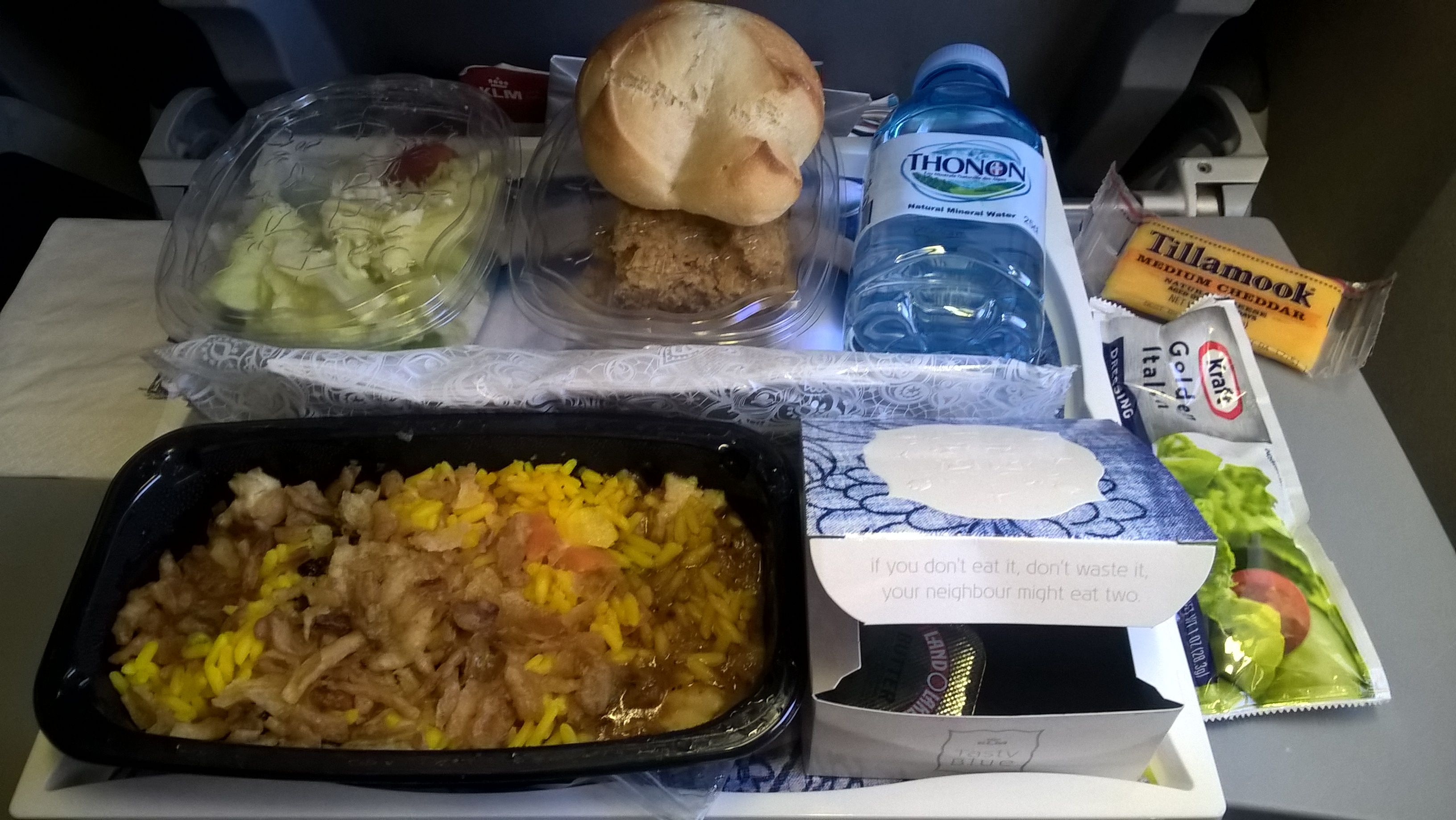 Спочатку мигдальні горішки і напої: Потім гаряче: рис з куркою, салатик, десерт, водичка, булочка з маслом і сиром, напої. За кілька годин морозиво За півтори години до прильоту погодували вдруге - чібата з сиром, салатик - помідори, моцарелла, песто. Десерт, водичка, напої. Періодично розносили по салону водичку і соки, або можна було самому взяти на кухні в районі 50-го ряду (летів Боїнг 747).