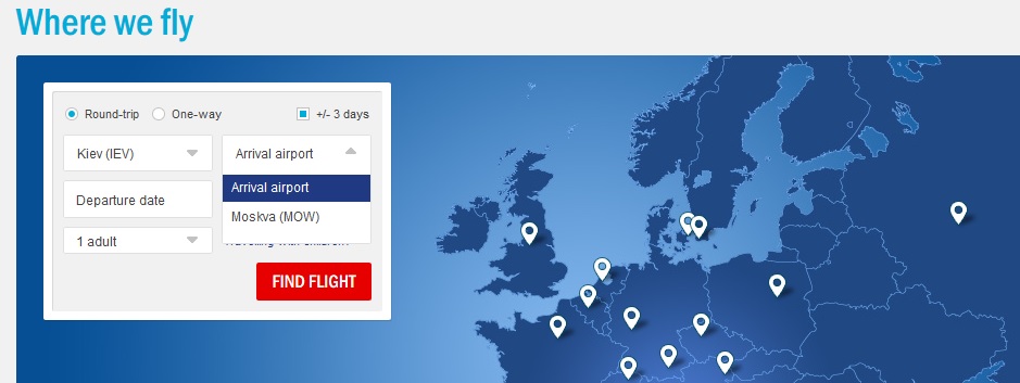 При этом на сайте компании Киева ещё нет на карте, а в списке городов единственный вариант перелёта из Киева такой...