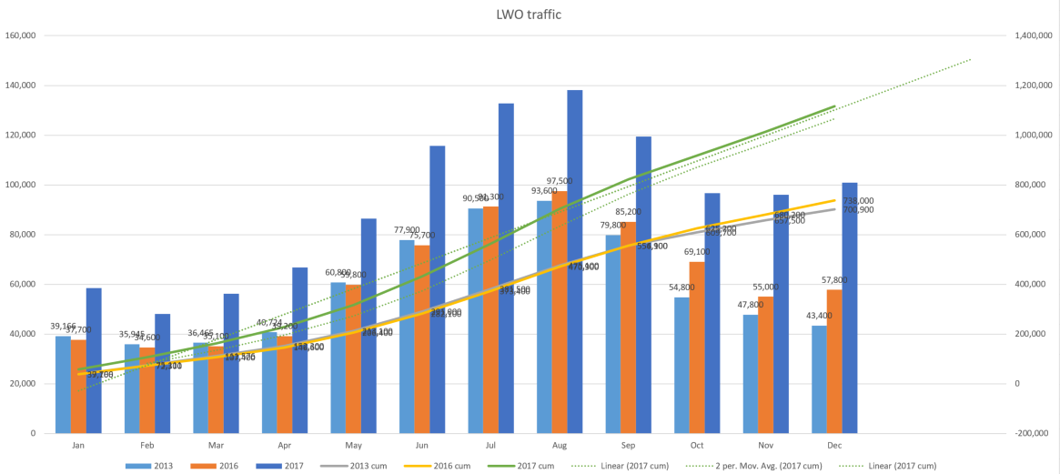 Привет. Кто собирает статистику каждого месяца? Не хотите ли построить цветной линейный график? Было бы интересно посмотреть на тренды и как одни аэропорты соотносятся с другими.
