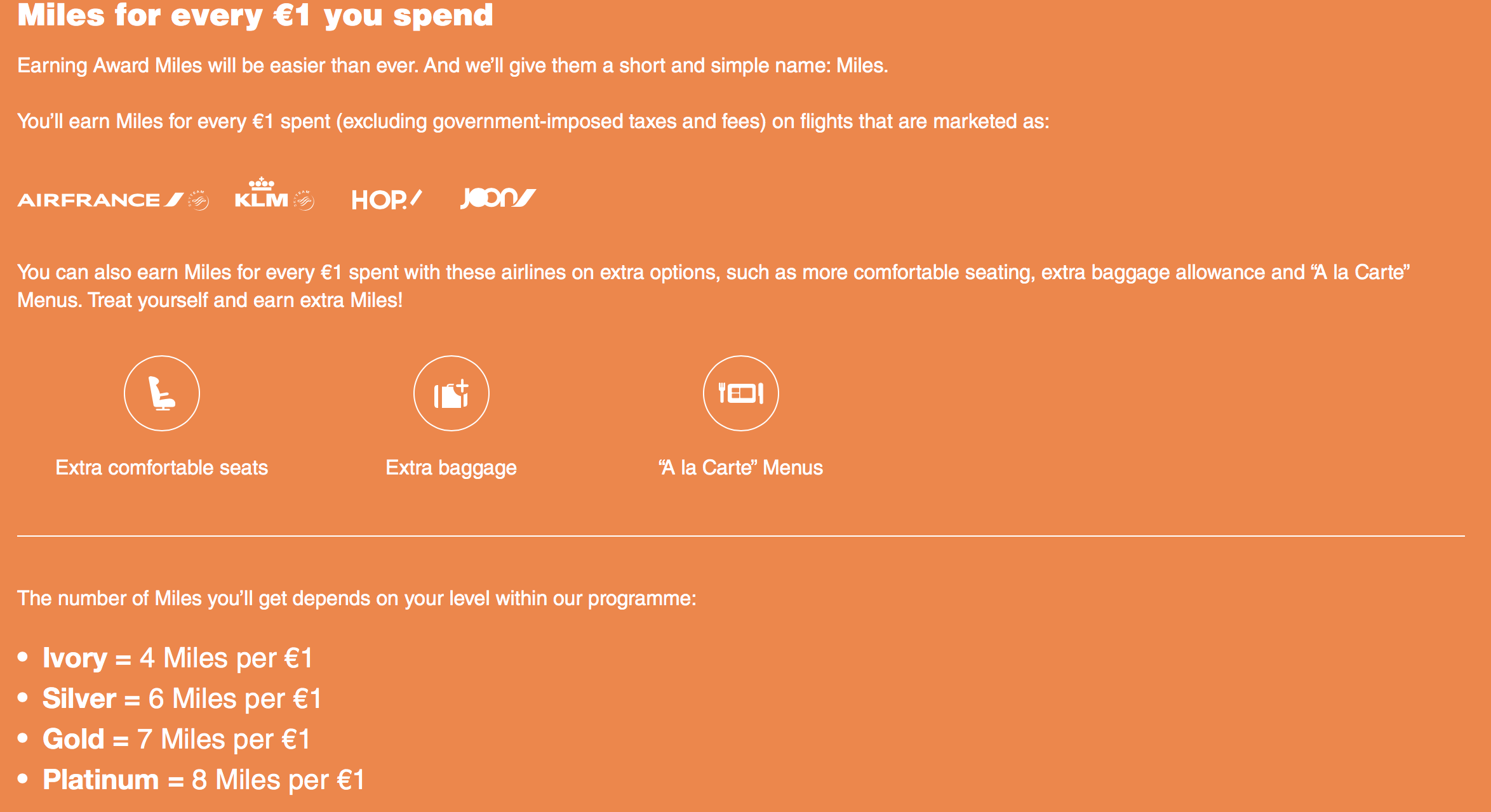От такого не знайшов. Раніше була приблизно така система для Award Miles. Але тепер не буде Award i Level Miles, просто Miles і все (фактично це Award). Пишуть що отпримаєшь 6 миль за кожне Євро. Про різницю між стусами нічого не пишуть (Статусу платінум взагалі нема, є така карпоративна картка Амех).Sentry писав:Кроме того, начисление миль теперь будет зависеть от стоимости билета, а не расстояния, и также очень существенно от статуса. Если Айвори получит 4 мили за евро, то Платинум - 8 миль за тот же евро, насколько я помню.