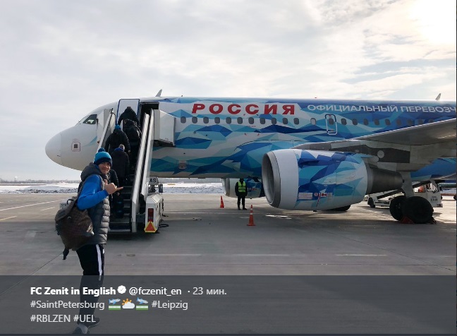В 11.00 Зенит вылетел из Питера в Лейпциг на брендированном под команду А320 от России.