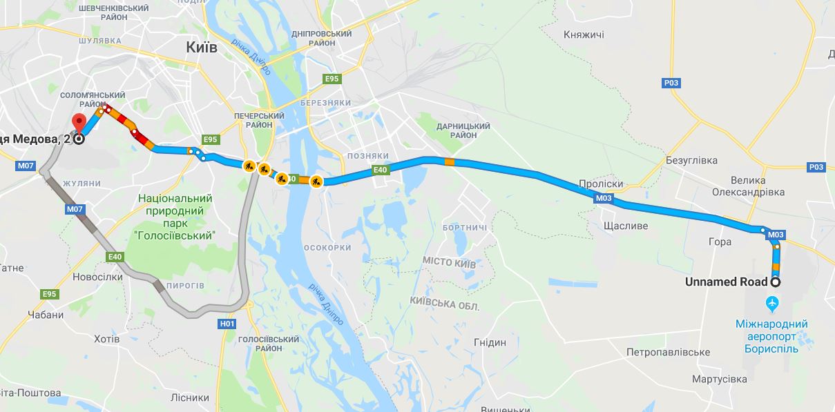 Не успеете. Во-первых, тянучка из Борисполя в связи с ремонтом подъездной дороги. Во-вторых, на скрине видно, что Южный мост тоже ремонтируют. В-третьих, подъехать к Жулянам можно со стороны проспека Лобановского (возле улицы Головка часто пробка) и Севастопольской площади (тоже часто тянется), либо же ехать в сторону окружной (по дороге с Московской площади тоже могут быть пробки).