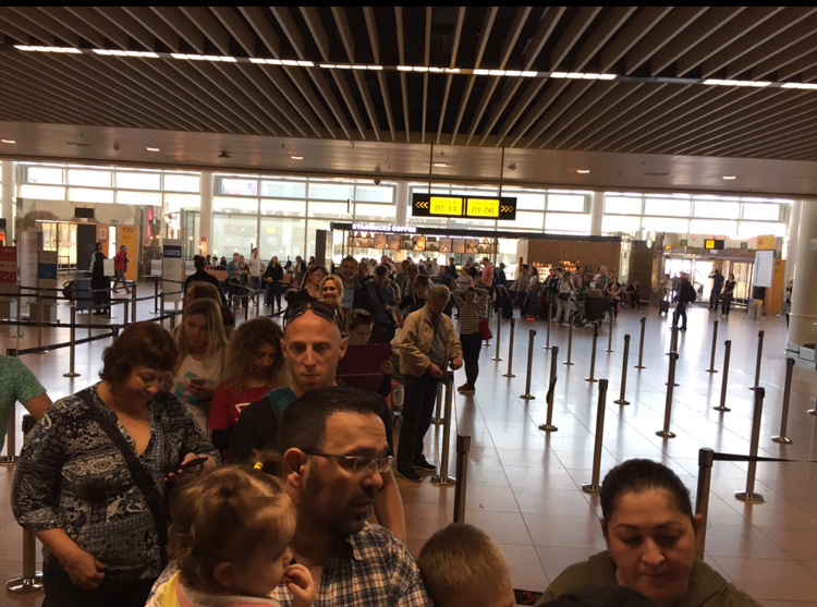 Очередь на чек-ин дневного рейса МАУ из Завентема. Такое впечатление, что летит 777. С другой стороны, видно, как много людей летят с багажом. В очереди много местных—летят в Дубай, Стамбул, ещё куда-то. Открыто две стойки.