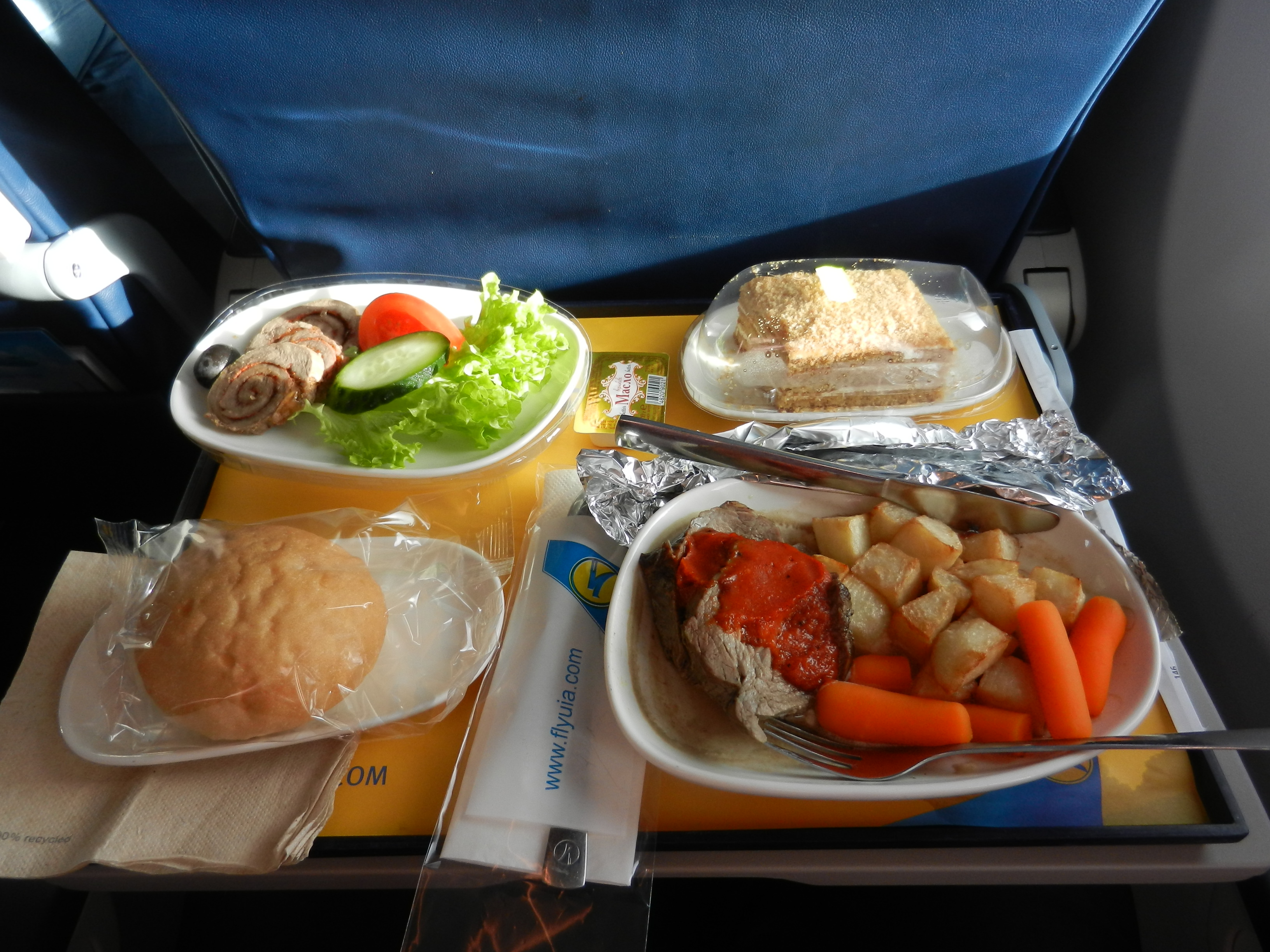 МАУ «без свинины» «из Европы в Украину» (отличается от «из Украины в Европу»). Ещё был кофе (растворимый), принесли в чашке уже растворённый (по дороге «туда» на подносе была чашка с горячей водой, и дали стик без мешалки )) )