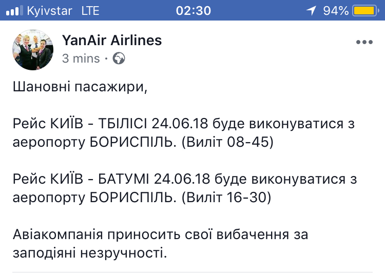 Жесть какая. Я так понимаю , в официальной группе Ян Эйр это есть, а смс на телефон нет? Это же сколько человек может в поезде ехало под рейс и утром за час до вылета будут в Жулянах, а там , блин, никакой регистрации. А они ни сном, ни духом. Да и в принципе люди, живущие на правобережке себе завели будильник, чтобы быть в Жулянах за час полтора до вылета, а тут такое. Интересно первое мнение неулетевших, хотя ян эйр может по привычке и не вылетел никуда