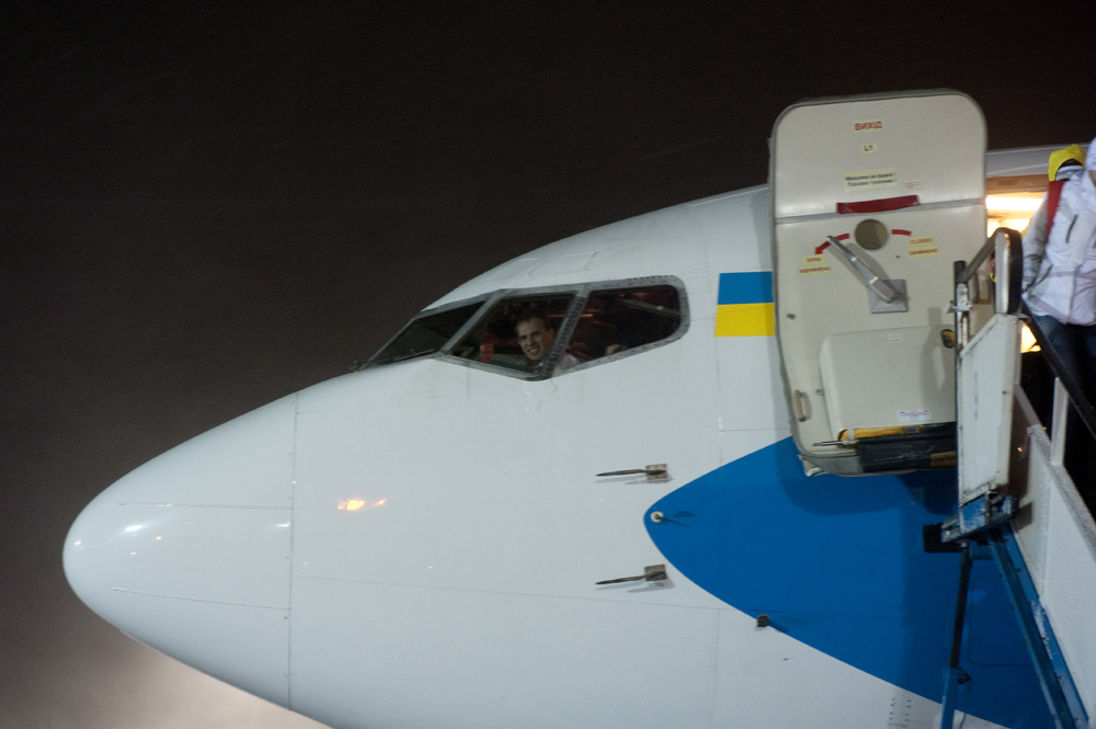 КВС Александр Дендера представился, рассказал о погоде в Киеве. Весь полет проходил достаточно низко - на эшелоне 290. Посадка на полосу 36R вышла очень мягкой, не смотря на очень сильный ветер (порывы до 20 м/с). Увидев воочию, что там твориться, я понял, что нам еще крупно повезло. Потом друзья рассказывали, что много самолетов ушло на запасные, многие долго кружили в зоне ожидания. Нам дали стоянку S11, однако по прибытию на предполагаемое место, КВС стоянку никак не мог увидеть, ибо весь перрон был засыпан толстым слоем снега :alen: :flag: Кстати, Александр оказался очень приятным человеком, что подтверждают фотографии 8-)
