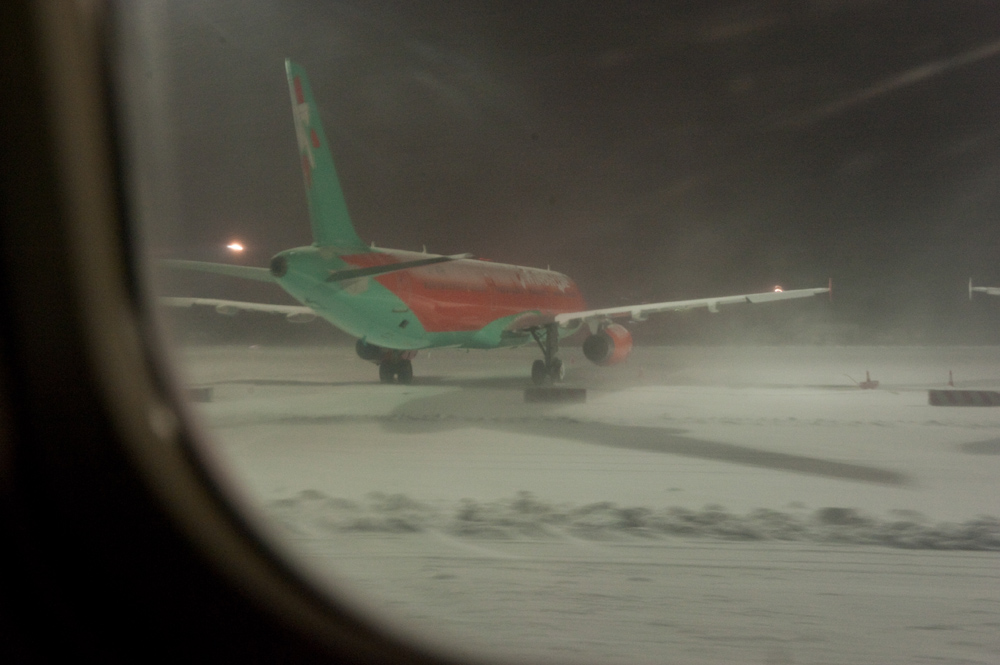 КВС Александр Дендера представился, рассказал о погоде в Киеве. Весь полет проходил достаточно низко - на эшелоне 290. Посадка на полосу 36R вышла очень мягкой, не смотря на очень сильный ветер (порывы до 20 м/с). Увидев воочию, что там твориться, я понял, что нам еще крупно повезло. Потом друзья рассказывали, что много самолетов ушло на запасные, многие долго кружили в зоне ожидания. Нам дали стоянку S11, однако по прибытию на предполагаемое место, КВС стоянку никак не мог увидеть, ибо весь перрон был засыпан толстым слоем снега
