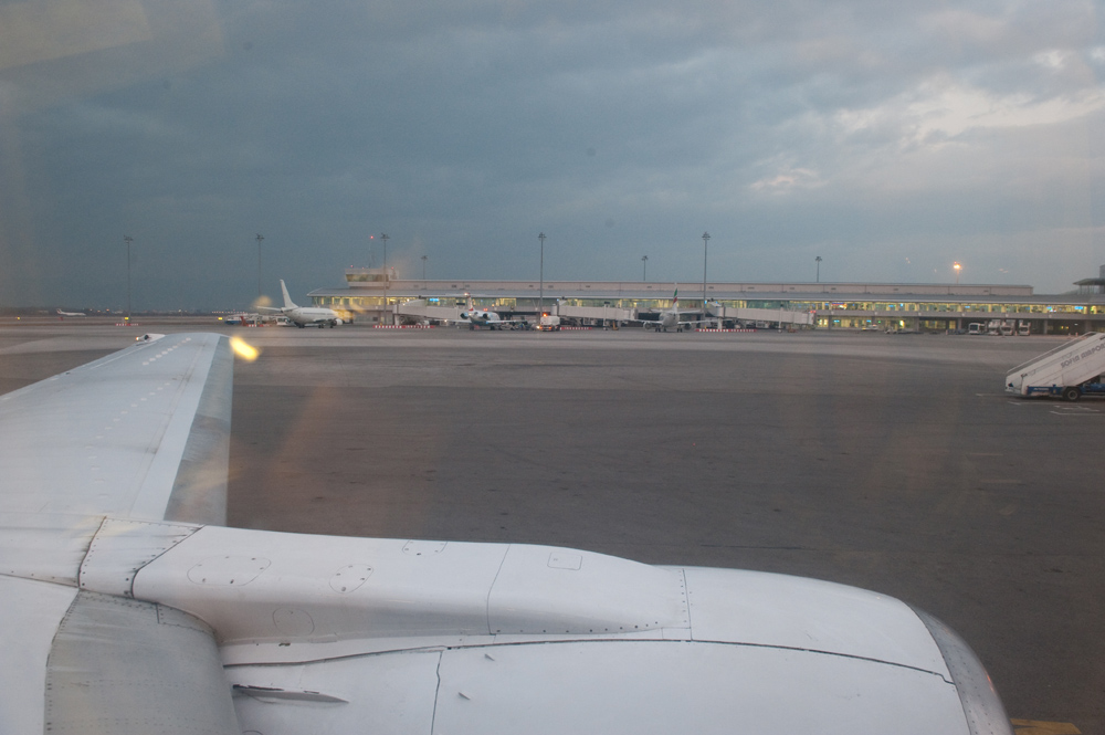 КВС Александр Дендера представился, рассказал о погоде в Киеве. Весь полет проходил достаточно низко - на эшелоне 290. Посадка на полосу 36R вышла очень мягкой, не смотря на очень сильный ветер (порывы до 20 м/с). Увидев воочию, что там твориться, я понял, что нам еще крупно повезло. Потом друзья рассказывали, что много самолетов ушло на запасные, многие долго кружили в зоне ожидания. Нам дали стоянку S11, однако по прибытию на предполагаемое место, КВС стоянку никак не мог увидеть, ибо весь перрон был засыпан толстым слоем снега