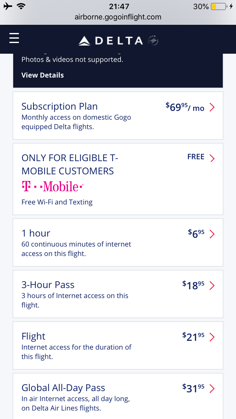 На рейсе Дельты весь полёт работал wifi--бесплатный для пользования мессенджерами, но для полного использования нужно было платить. Можно было получить час бесплатного полноценного интеренета пользователям амер. оператора T-Mobile--у меня был номер телефона этого оператора, по которому я смог залогиниться на бесплатный час интернета. Примечательно, что перед началом использования wifi вам напоминают, что федеральный закон запрещает использовать бортовой интернет для видео и аудио-звонков, просмотров фильмов с внешних сервисов и т.д. Но фотографии в фейсбук грузились нормально.