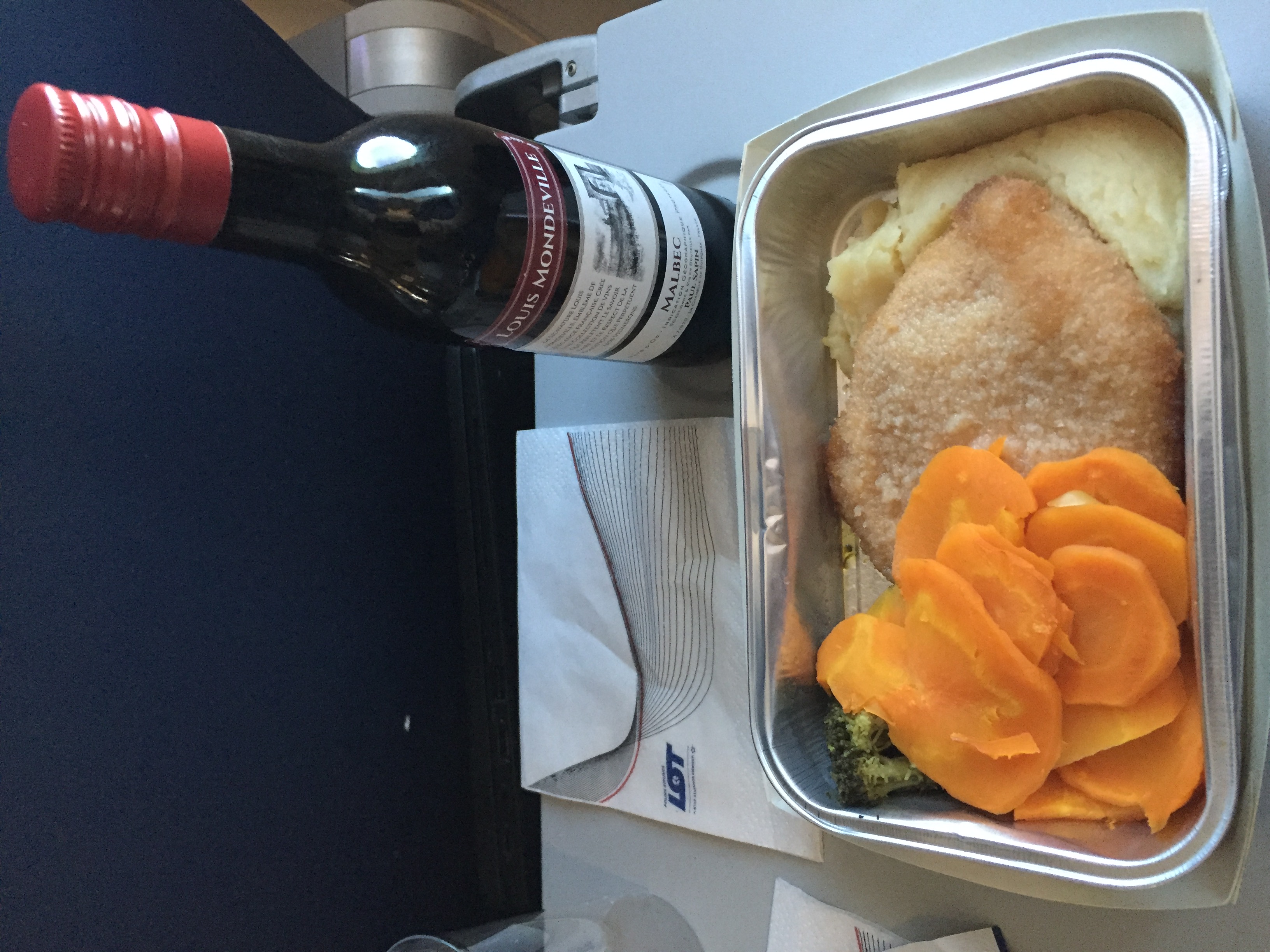 Наверно, самое дешёвое горячее питание, которое за деньги: 4 евро (курица в панировке с картошкой, морковкой и броколи), с вином—6.
