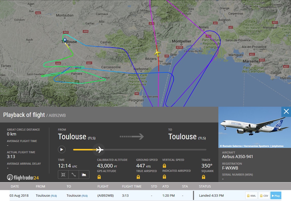 Выполнял как минимум два (2.08 и 3.08) каких-то, по всей видимости, тестовых полёта. К сожалению, полёт за 2.08 заскринить не успел, полёт на FL430 был более длительным и проходил над Бискайским заливом.