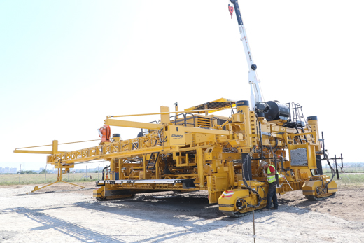 Тестовая укладка полосы началась с южного торца (курс 34). Пока что работники компании учатся управлять бетоноукладчиком, чтобы впоследствии обеспечить ровный слой бетонного покрытия. Машина делает полосу шириной 7,5 метров и толщиной примерно 40 сантиметров.