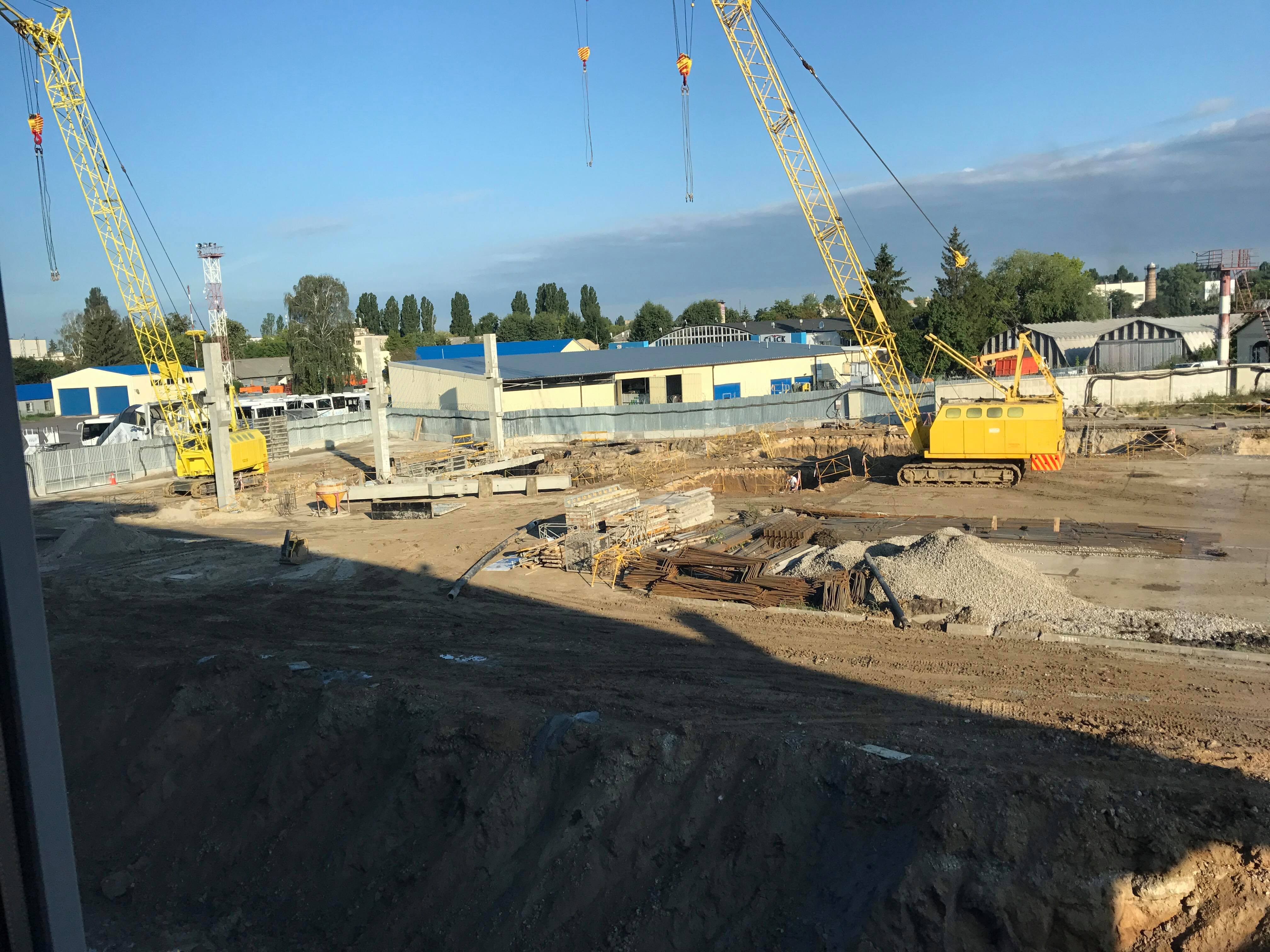 По правую руку от центрального входа видны краны и техника строительная ездит в ту сторону.