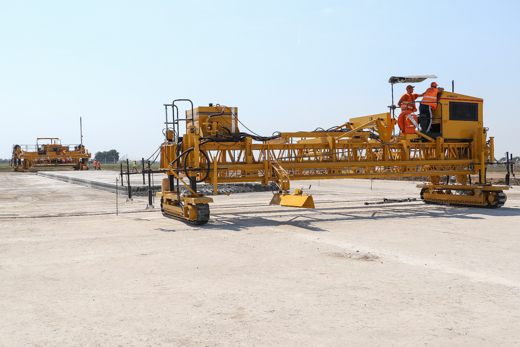 Тестовая укладка полосы началась с южного торца (курс 34). Пока что работники компании учатся управлять бетоноукладчиком, чтобы впоследствии обеспечить ровный слой бетонного покрытия. Машина делает полосу шириной 7,5 метров и толщиной примерно 40 сантиметров.