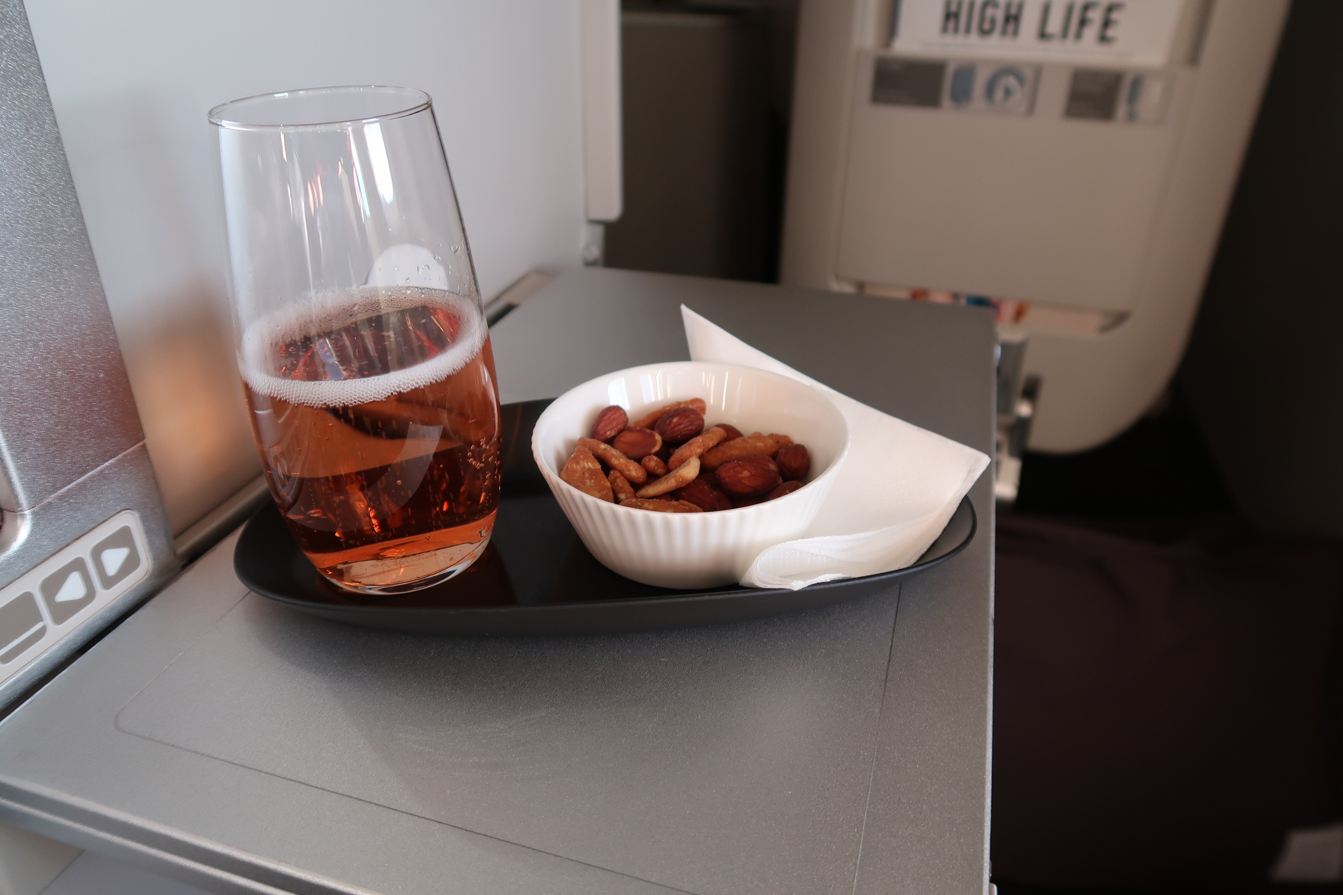Ужин, перед прилётом—мини-завтрак из коробочки. На каждом сиденье сразу лежала бутылка воды 0.5. В отличие от КЛМ, где вино подаётся в бутылках, в Дельте бортпроводники наливают его из огромных бутылок (литровых или даже больше) в стаканы. Стаканы у Дельты больше и покрепче КЛМ-овск х да и вообще любых европейских.