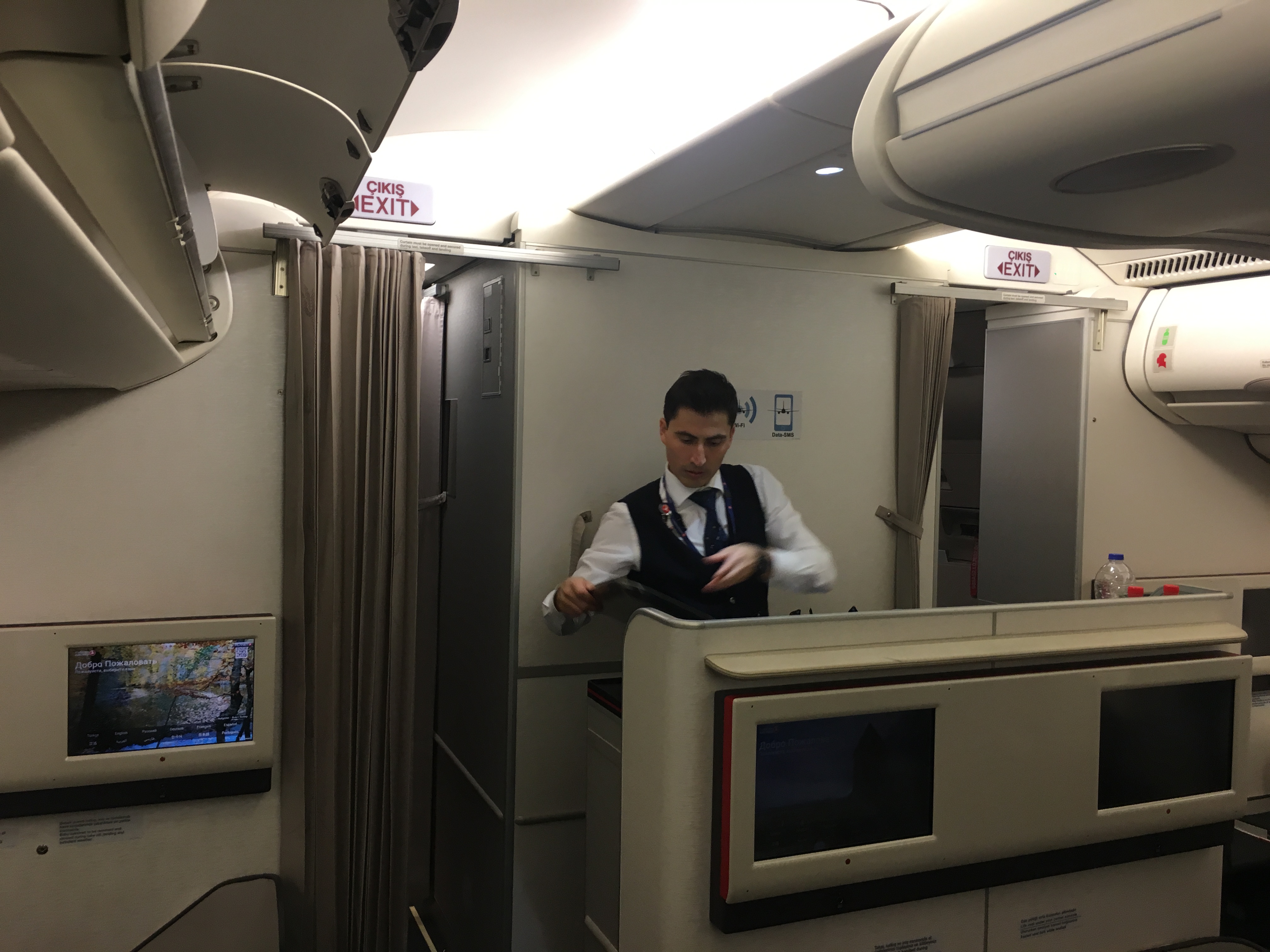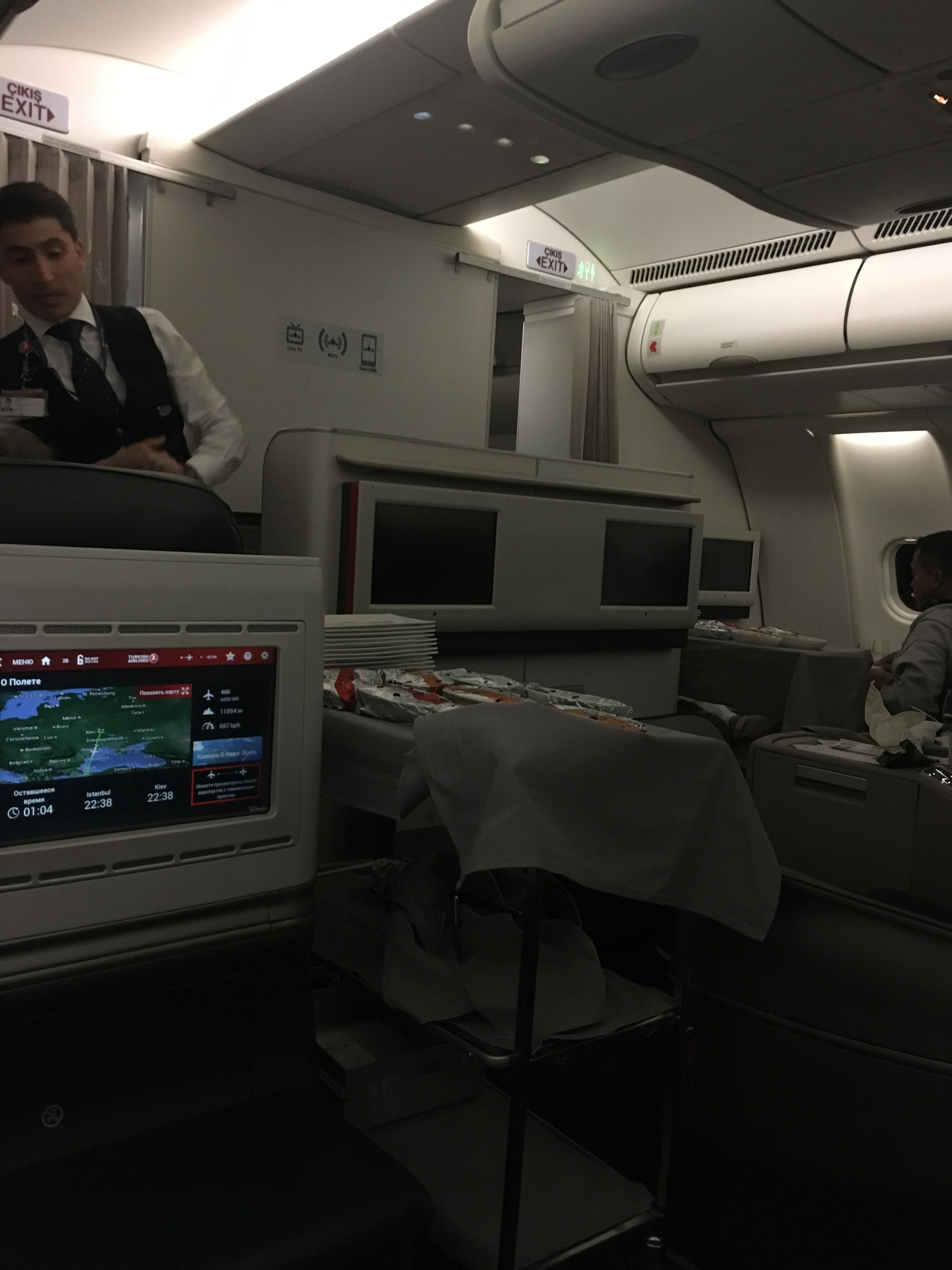 Сегодншние рейсы Стамбул-Киев-Стамбул выполнял Airbus A330-300 с регистрационным номером TC-JNO, выпущенный в марте 2012 года в конфигуряции 28 мест в бизнес-классе и 261 мест в экономическом классе. Салон бизнес-класса представляет собой 1 ряд 2-2 (по 2 кресла у окна) и 4 ряда 2-2-2. В первом ряду вместо среднего блока кресел расположен бар. Кресла полностью соответствуют лучшим мировым стандартам full flat bed, очень много места для мелочевки, отличная мультиязычная система развлечений с шикарными наушниками.