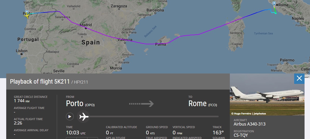 В понедельник также летел ЦСКА в Мадрид на A320 от Аэрофлота, но не на своем брендированном VP-BWD.