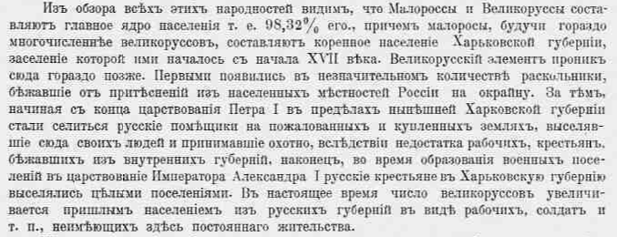 там ще до Петра І росіяни на Харківщину переселялися, але їм дуже не подобався степовий клімат, дуже відрізнявся від їх рідного, а ще татари з Муравського шляху. Росіяни татар дуже боялися. Тому серед них в основному були невольні переселенці - військові і монахи, останні дуже часто тікали назад. Потім Польща почала АТО проти Богдана Хмельницького і багато біженців з Подніпров'я і навіть Галичини та Волині почало переселятися (звідси і Золочів), вони були вже краще адаптовані до степових реалій. Цар спочатку не дуже хотів давати українцям (тоді їх називали "черкасами") права як у Польщі, тому Іван Сірко наприкінці 1650х трошки влаштував місцевим росіянам "одеський будинок профспілок" - спалив кілька російських військових поселень і відкочував назад у степ. Потім вони з царем помирилися - Сірко покаявся, а цар дав полкове самоуправління, виборні суди і т.д. для укропів. Після Петровської модернізації козацька старшина масово русифікувалася, бо московські порядки більше не асоціювалися з відсталими. Ну а потім і простий народ закріпачили...