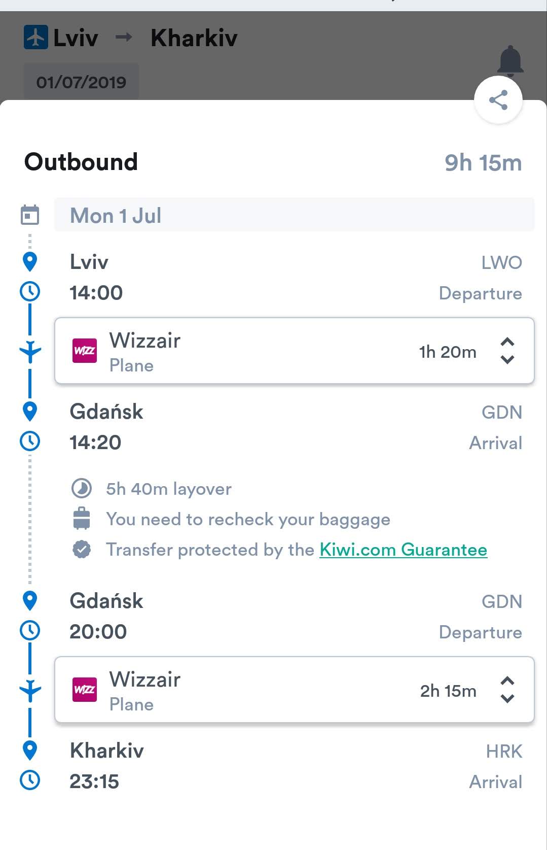 З непрямих перельотів ось варіант перельоту зі Львова до Харкова через Ґданськ на найближчий понеділок