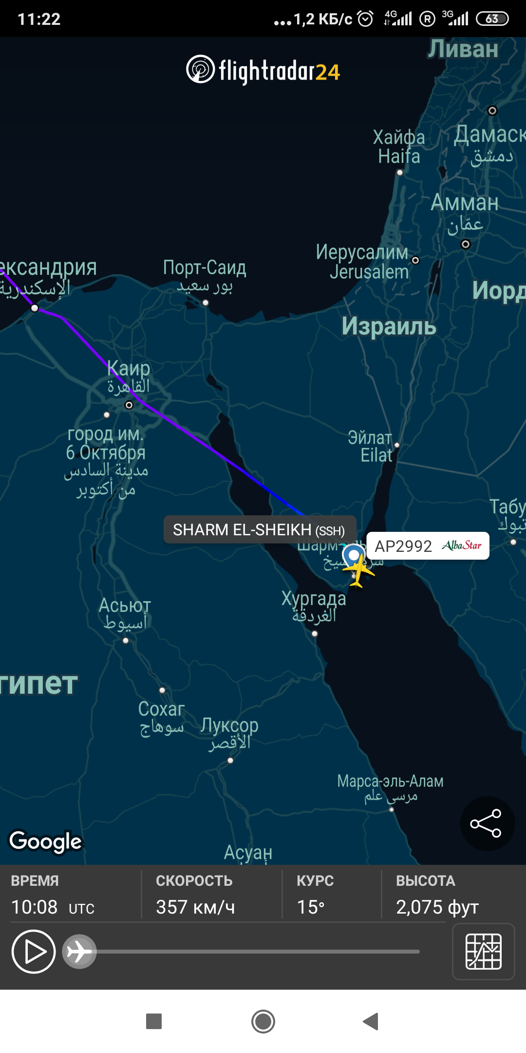 В прошлом году летели вдоль побережья Синая, в 30-50 км восточнее Каира. Перелёт был 3:20.