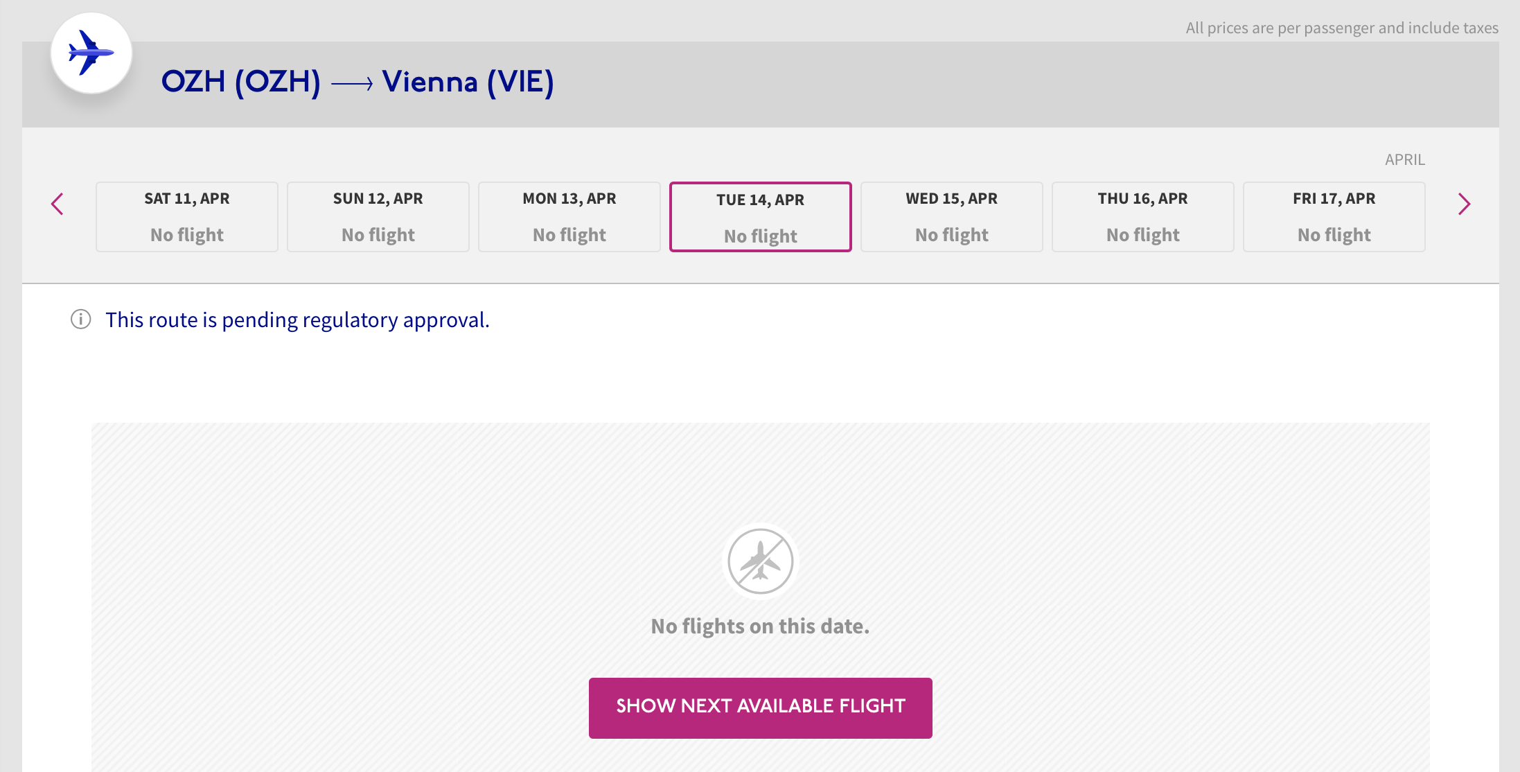 На маршруте OZH-VIE появилась информация "This route is pending regulatory approval." (утром не было).