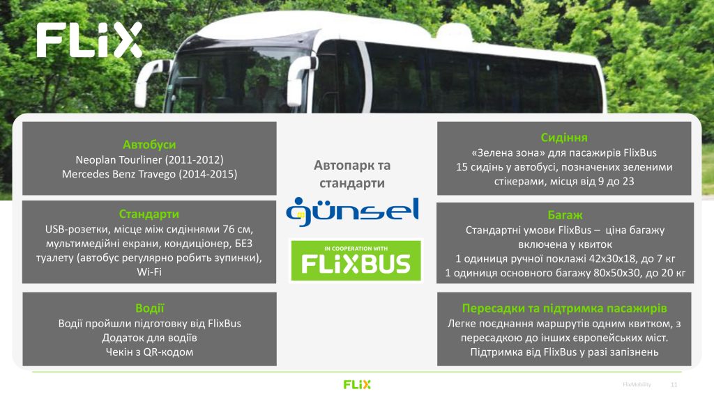 У кожному автобусі Gunsel на зазначених маршрутах буде 15 маркованих сидінь для пасажирів Flixbus