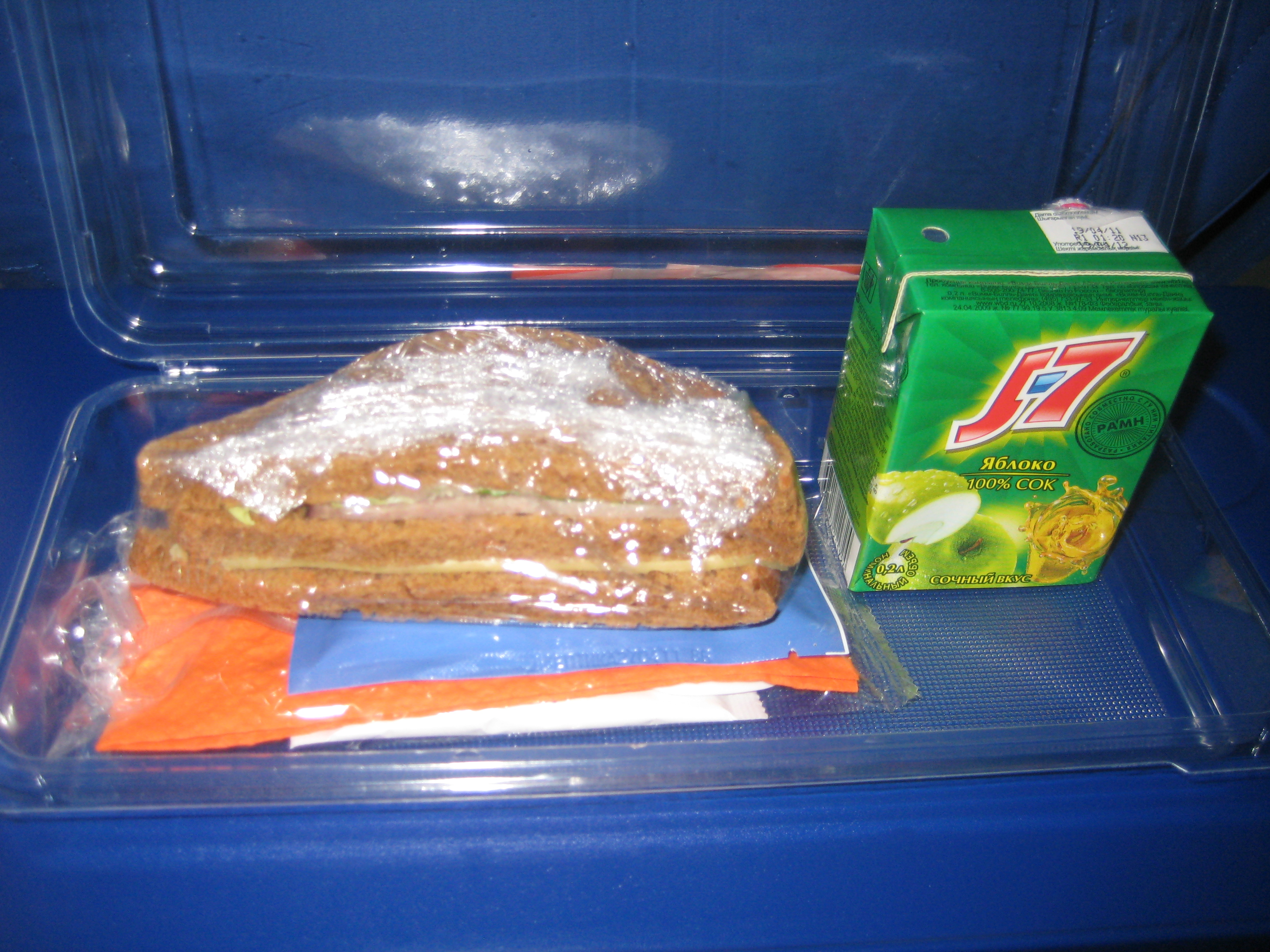 Кормили сразу после взлёта, возможно, самым вкусным несладким (сыр + томаты) горячим мультизерновым круасаном, который я когда-либо ел. Потом через какое время принесли невероятно вкусные и очень голландские штуки, которые даже не знаю, как по-русски назвать. (Голландского названия на упаковке не было). А на подлёте к Амстердаму разносили поднос-корзинку с разным печеньем, марсом, мятными конфетами и т.д. Напитки весь полёт--соки, кола, чай, кофе.