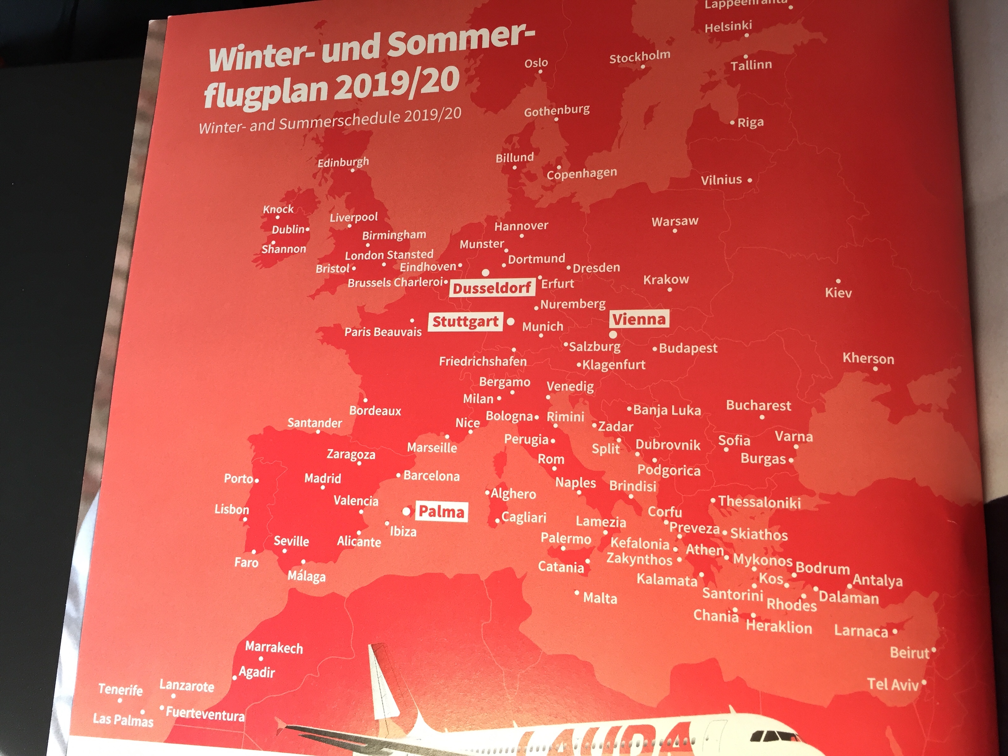 После полёта Ryanair, где бортпроводники возили тележки с едой и напитками за рейс раза три, а потом ещё товары, и ещё лотерейку, заметно, что от бортперсонала Лауды не требуют таких активных продаж: один раз провезли тележку после вылета, и всё.