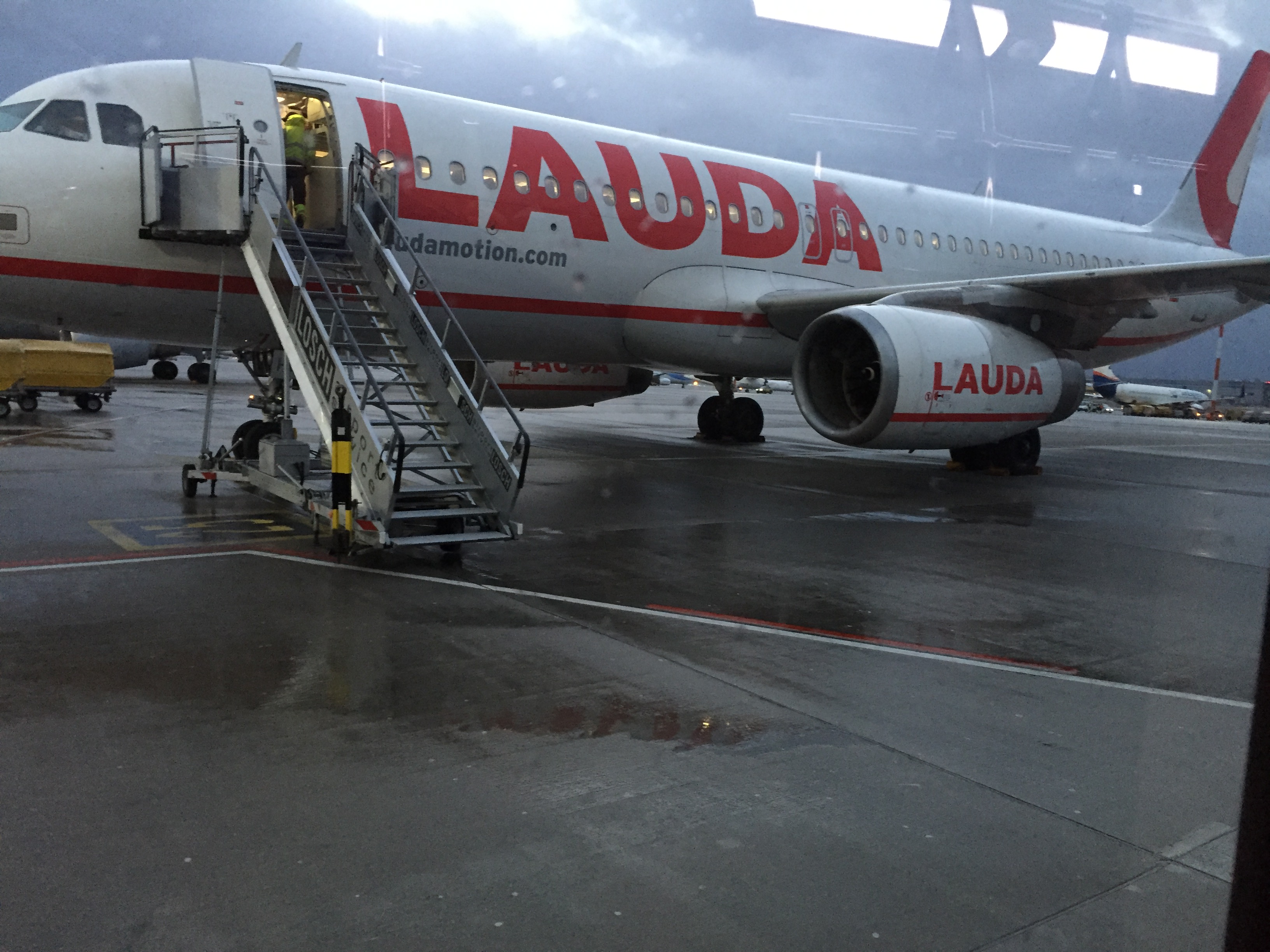 После полёта Ryanair, где бортпроводники возили тележки с едой и напитками за рейс раза три, а потом ещё товары, и ещё лотерейку, заметно, что от бортперсонала Лауды не требуют таких активных продаж: один раз провезли тележку после вылета, и всё.