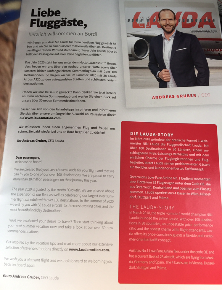 Судя по приветствию СЕО Laudamotion в их бортовом журнале, они предпочитают не упоминать о своём родстве с Ryanair.