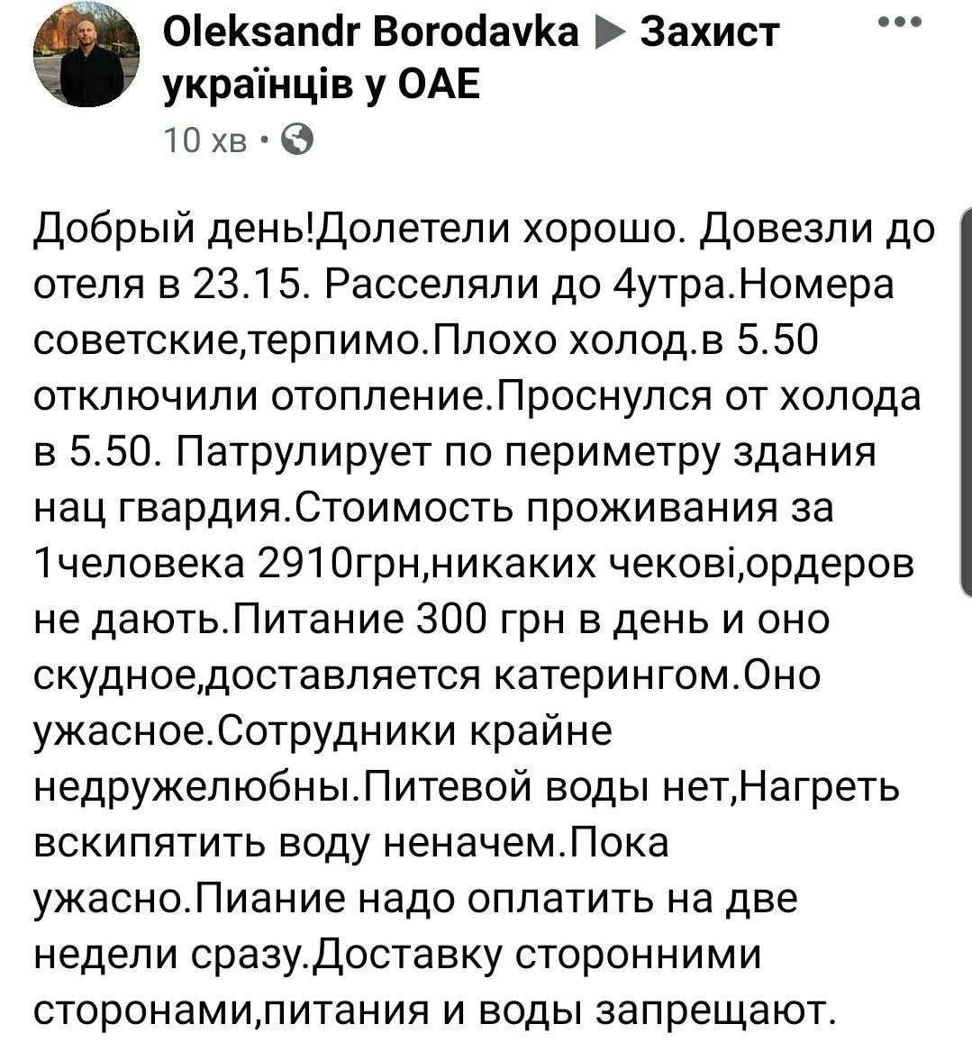 Прилетело по итогу 113 человек. Власть вообще наша ни чего общего не имеет с этим рейсом и попиариться на том какие они молодцы не получится, будут молчать. А рейс получился благодаря инициативе правительства ОАЭ и огромнейшей помощи Украинского посла в ОАЭ. Рейс был бесплатный для каждого пассажира + 10 тонн медицинского оборудования. Каждый человек который попал на рейс, подписал добровольно находится на карантине в отеле за свой счет.