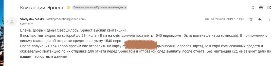 А в двух словах Некий Владислав уверенно заявлял мне о том, что Эрнест подписал к выплате полную сумму по моей брони...в итоге выплатили лишь часть...50% с которой этот самый Владислав назойливо и очень настойчиво возжелал получить мгновенную комиссию 40%...которую я по доверию ему и выплатила...позже выяснила для себя - он манипулировал мною....как последний мошенник! ну это моя проблема...поверила и доверила. в итоге я могу сделать вывод что вместо 1600 евро мне зашло 760,28 евро...с которых 40 % было переведено этому мошеннику...итог - вместо 40% с моей компенсации поимели 50% от общей суммы и 40 % от фактической выплаты..немало?)))